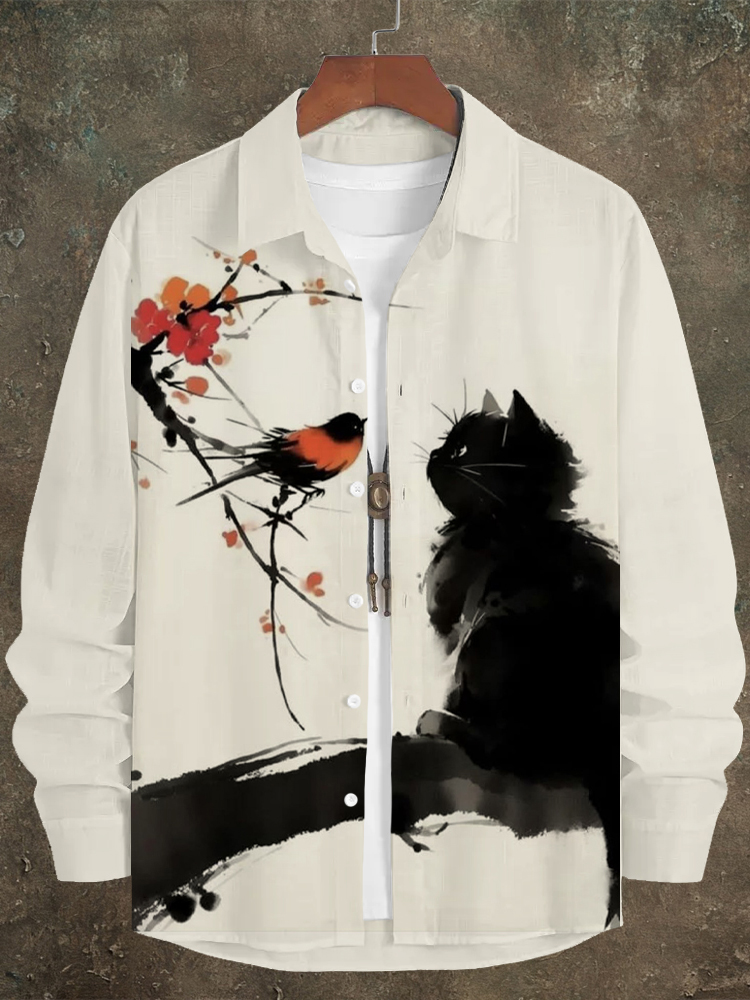 Black Cat & Bird Japanese Vintage Men's Linen Long Sleeve Shirt