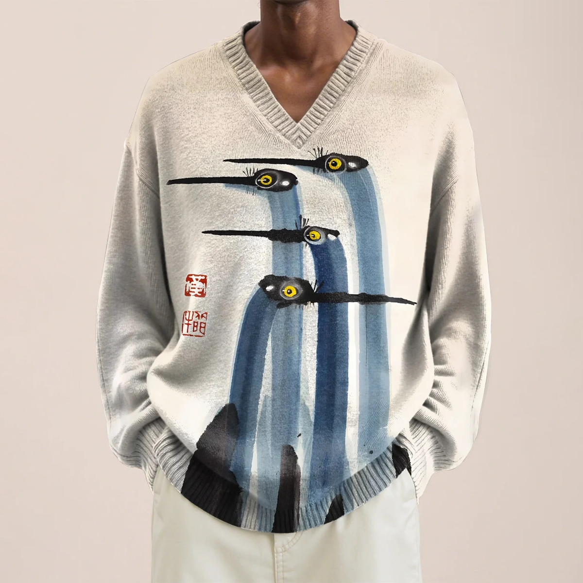 Men's Vintage Crane Art Print V-neck Lnit Long Sleeve Sweater