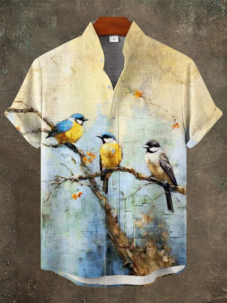 Japanese Vintage Bird & Flower Men's Linen Long Sleeve Shirt