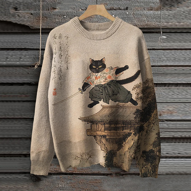 Men's Japanese Katana Cat Samurai Retro Print Casual Sweatshirt