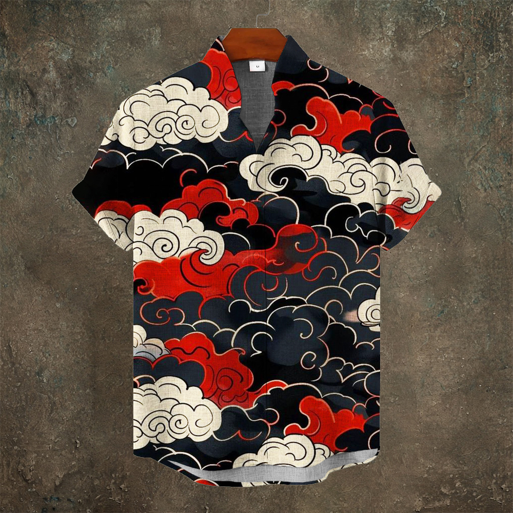 Japanese Cloud Print Men's Linen Short Sleeve Shirt