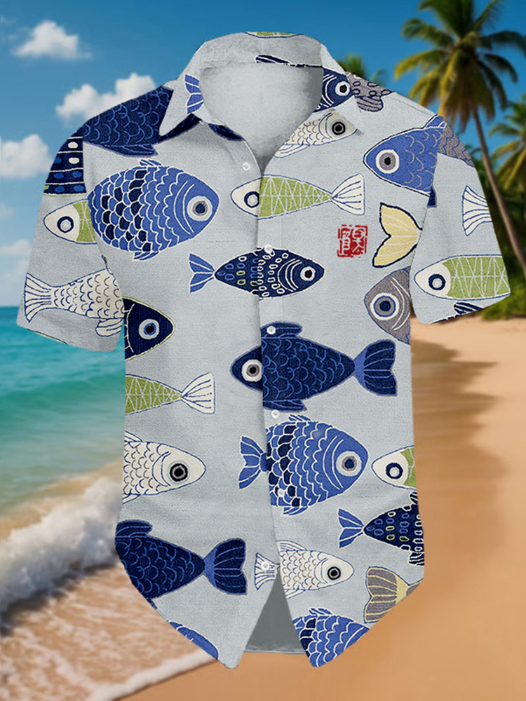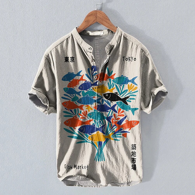 Men's Vintage Fish Japanese Art Beach Linen Shirt