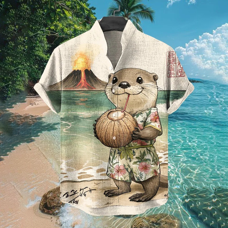 Men's Cute Otter Drinking Coconut Juice Print Short Sleeve Shirt