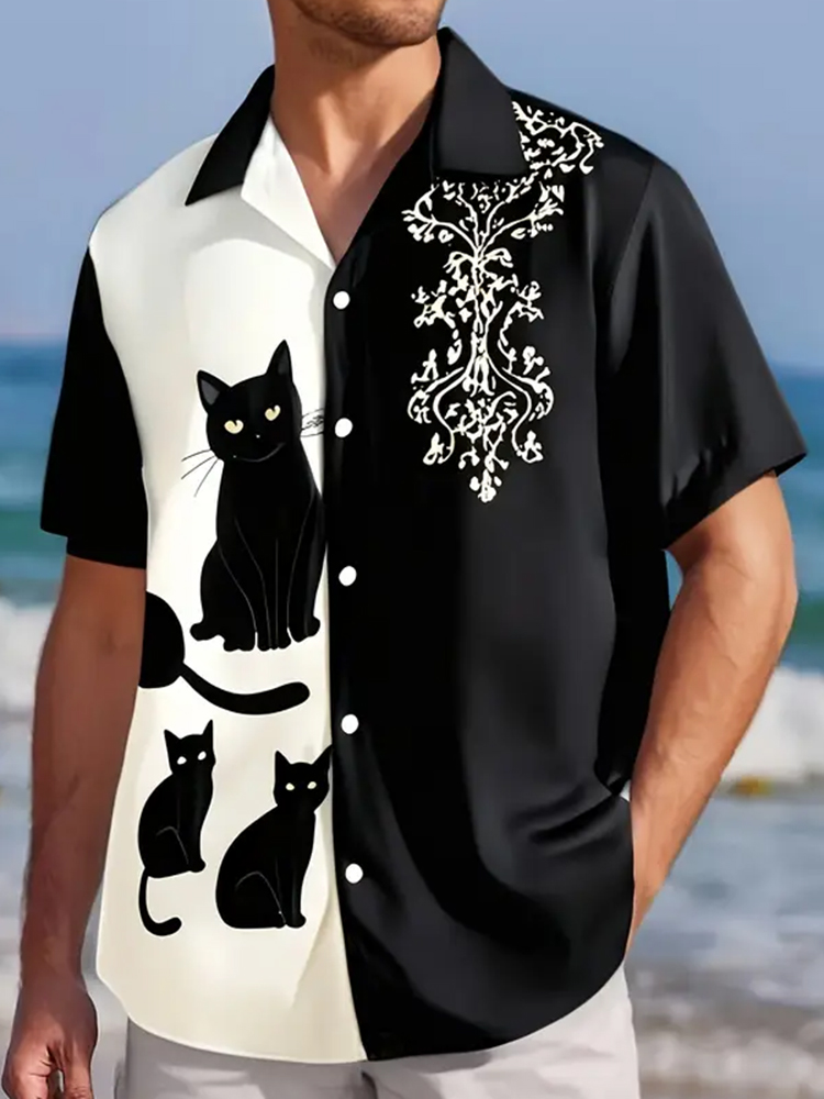 Vintage Cute Black Cat Hawaiian Art Casual Short Sleeve Shirts