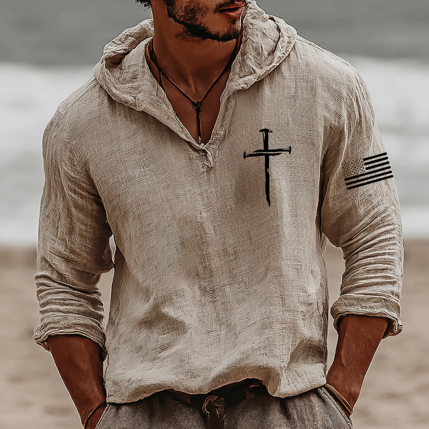 Men's Vintage Faith Cross Art Loose And Comfortable Cotton And Linen Hooded Shirt