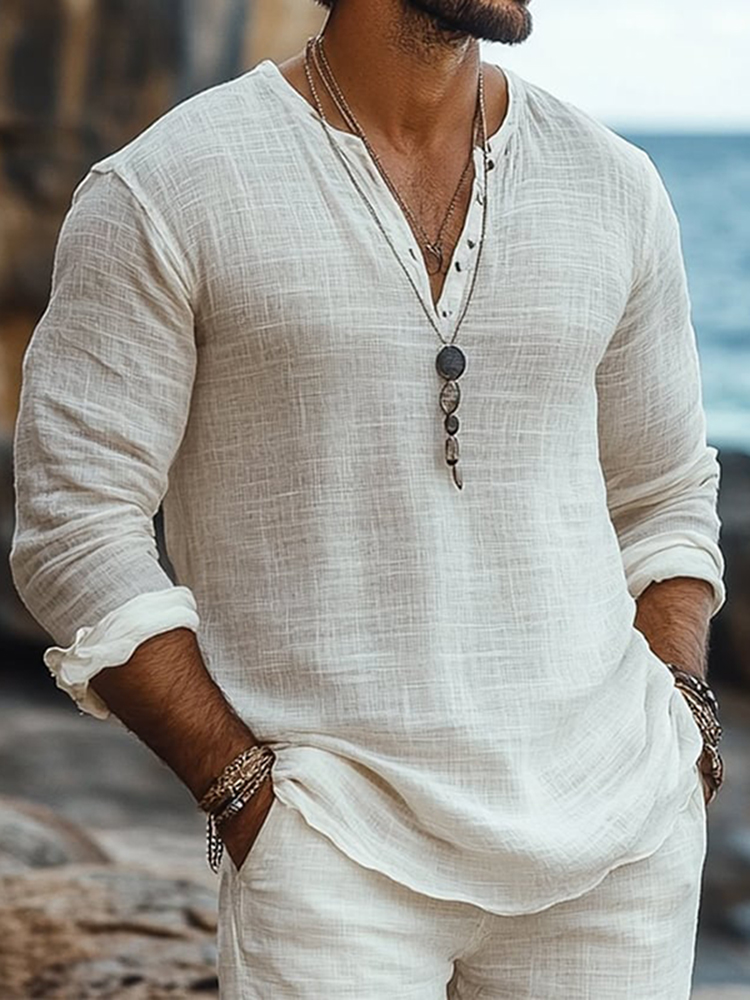 Men's Boho Solid Color Button Linen Shirt