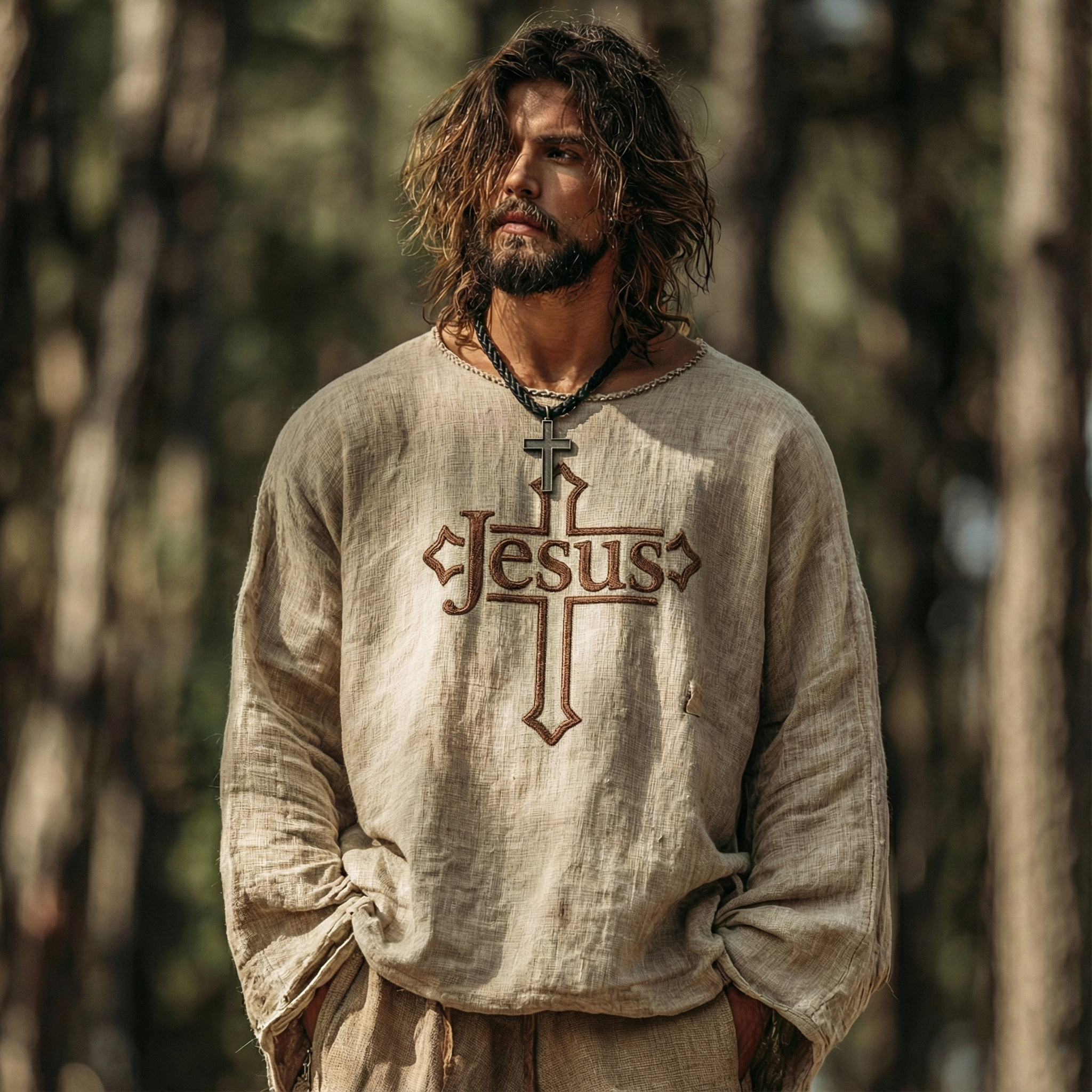 Men's Vintage Jesus With Cross Faith Art Loose And Comfortable Cotton And Linen Long-sleeved Shirt