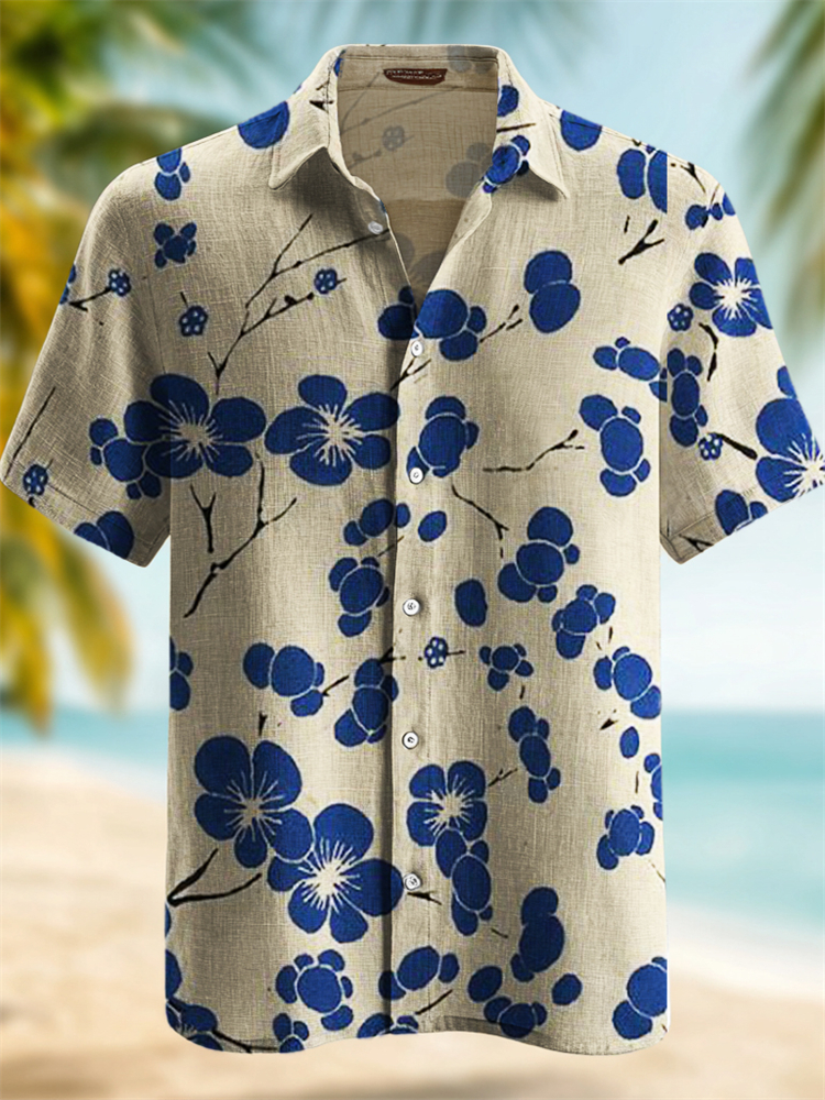 Men's Japanese Floral Lino Art Pattern Beach Linen Shirt