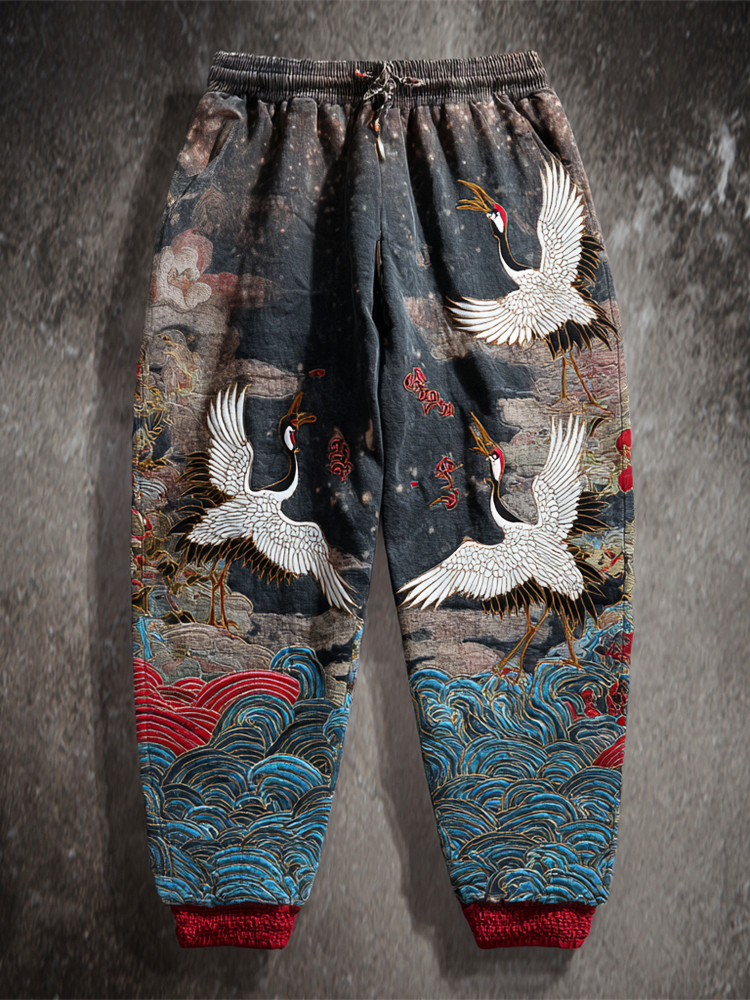 Vintage Japanese Wave & Crane Art Men's Casual Pants