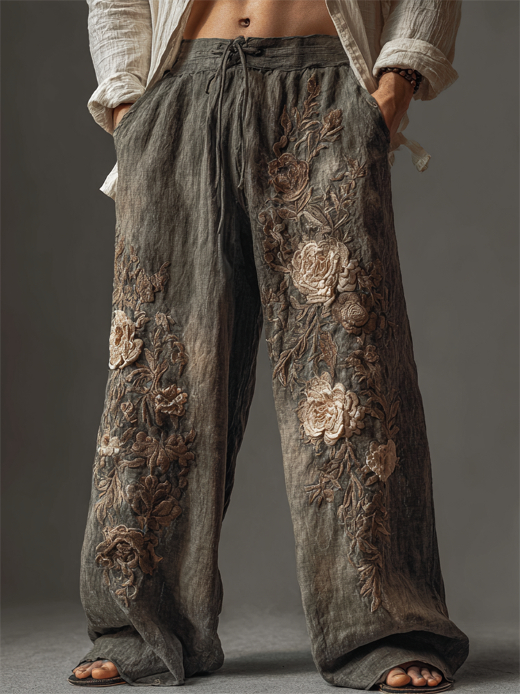 Men's Vintage Flowers Dusty Dyed Wide Leg Linen Pants