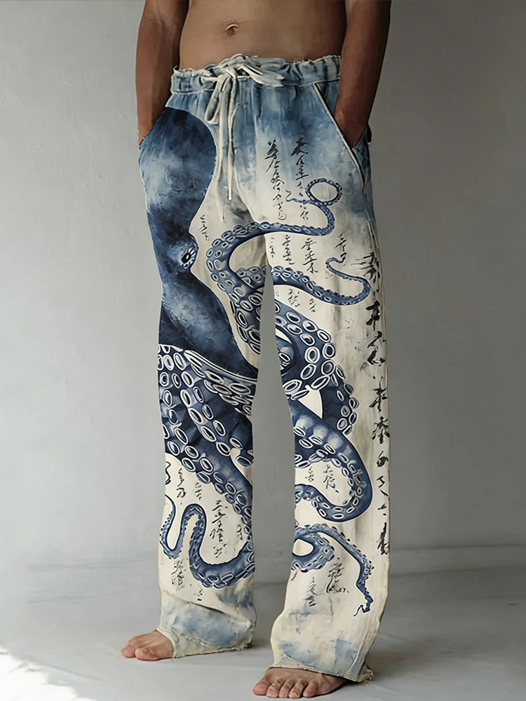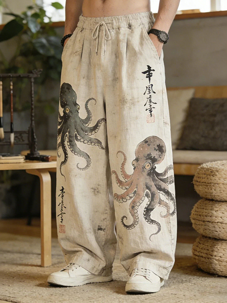 Men's Retro Japanese Art Ocean Octopus Print Casual Pants