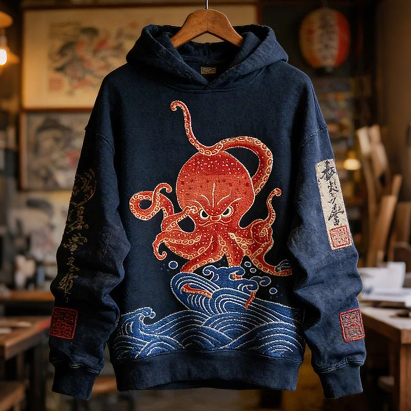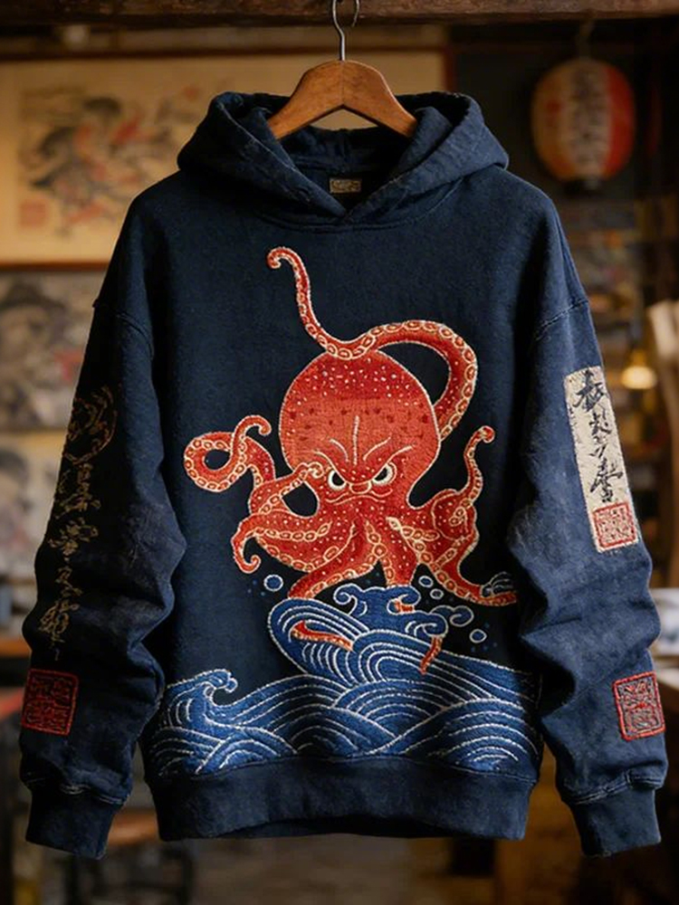 Men's Octopus Retro Calligraphy Print Casual Hoodie