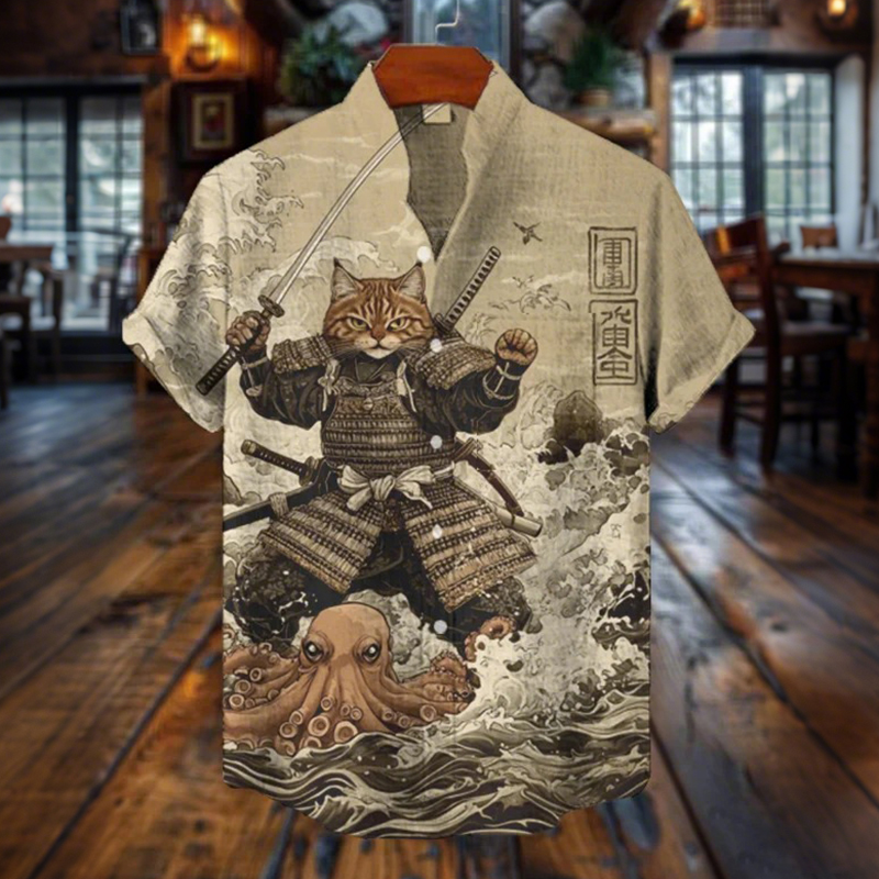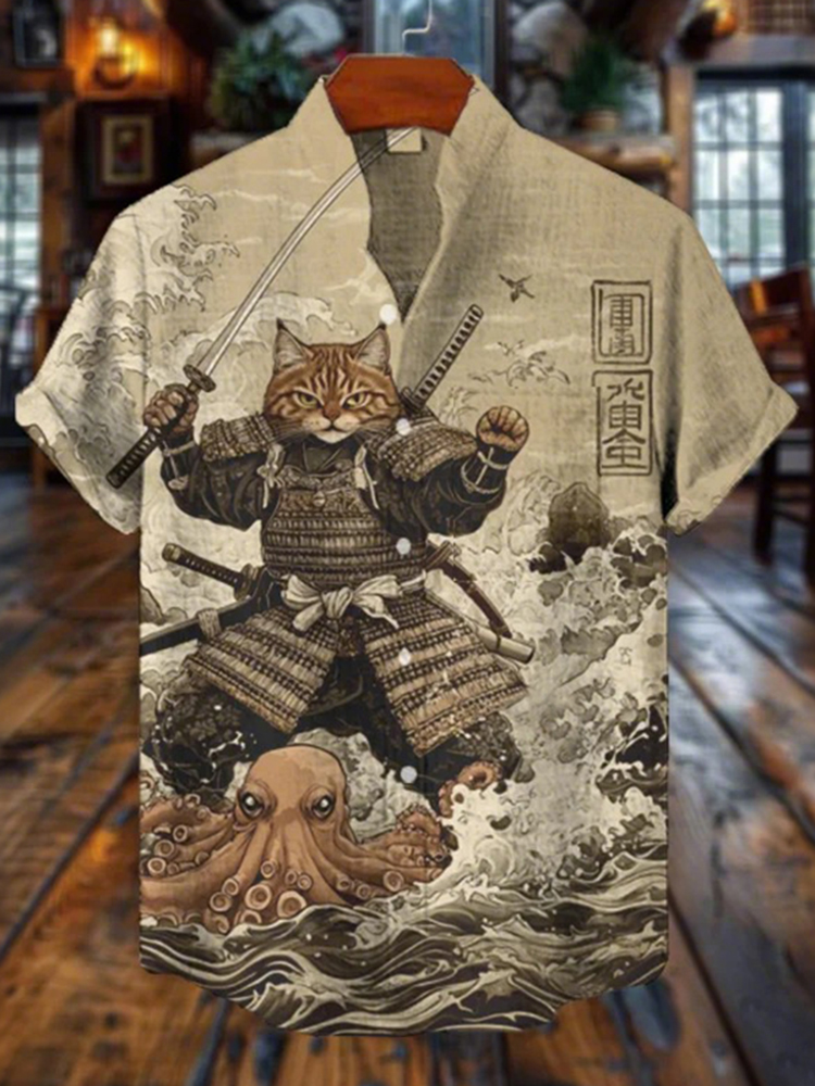 Men's Retro Cat Warrior And Giant Wave Octopus Print Linen Short-sleeve Shirt