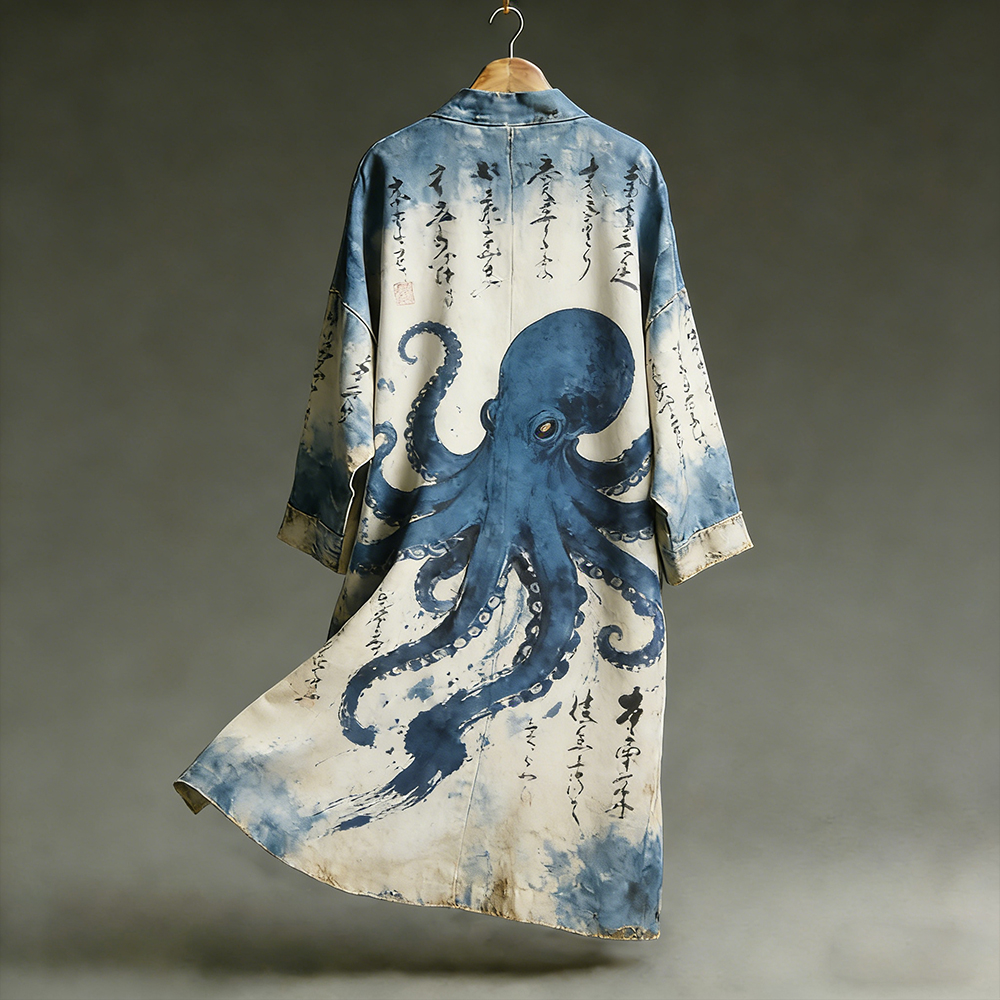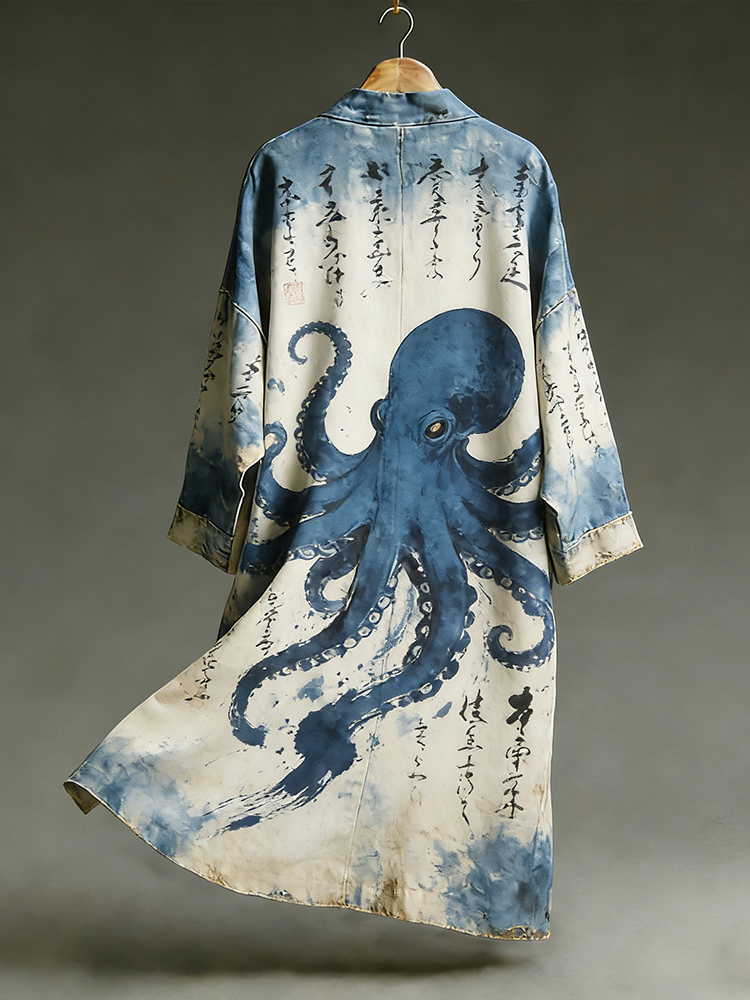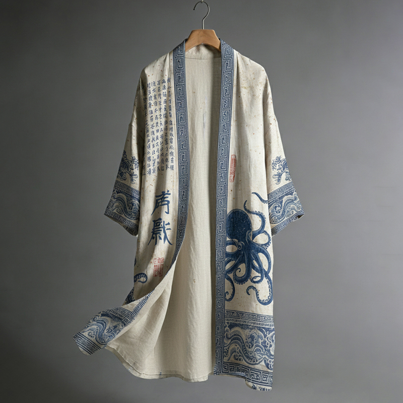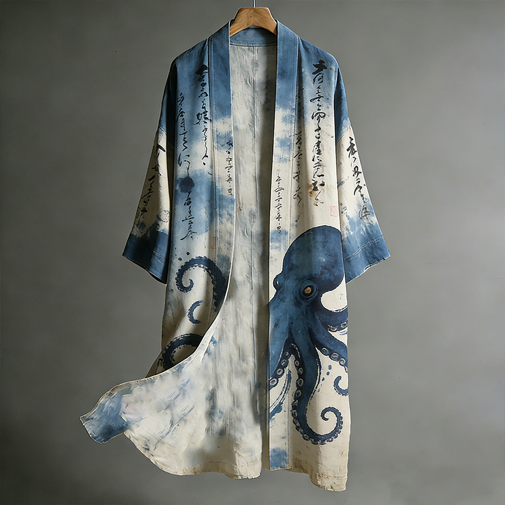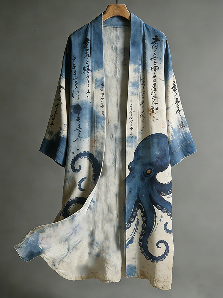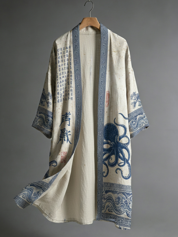 Men's Japanese Octopus And Calligraphy Art Pattern Casual Linen Kimono