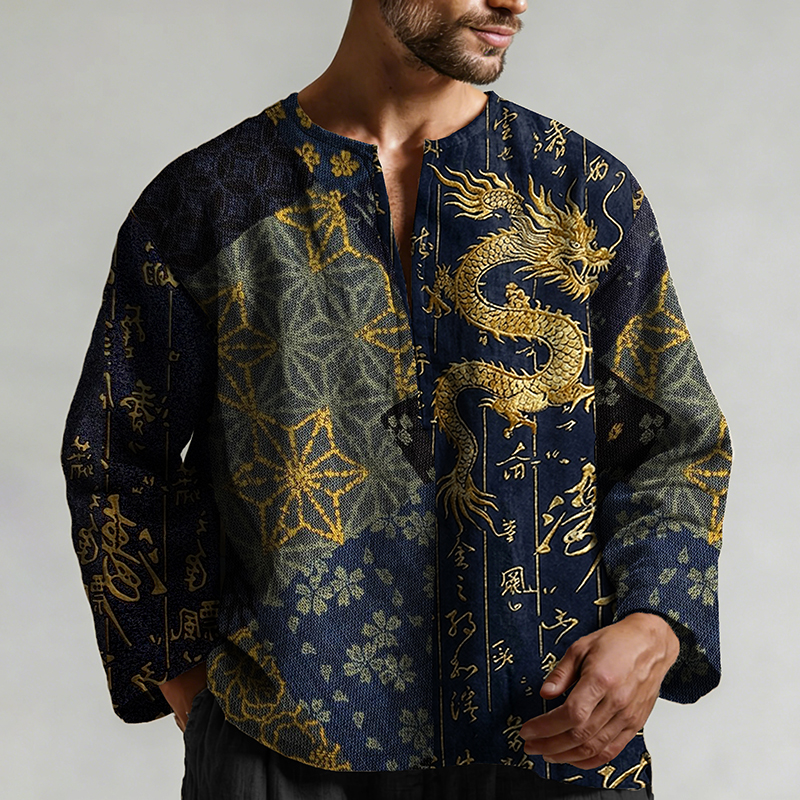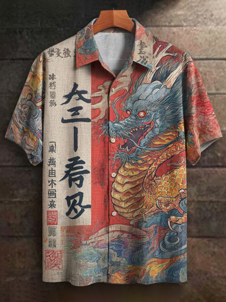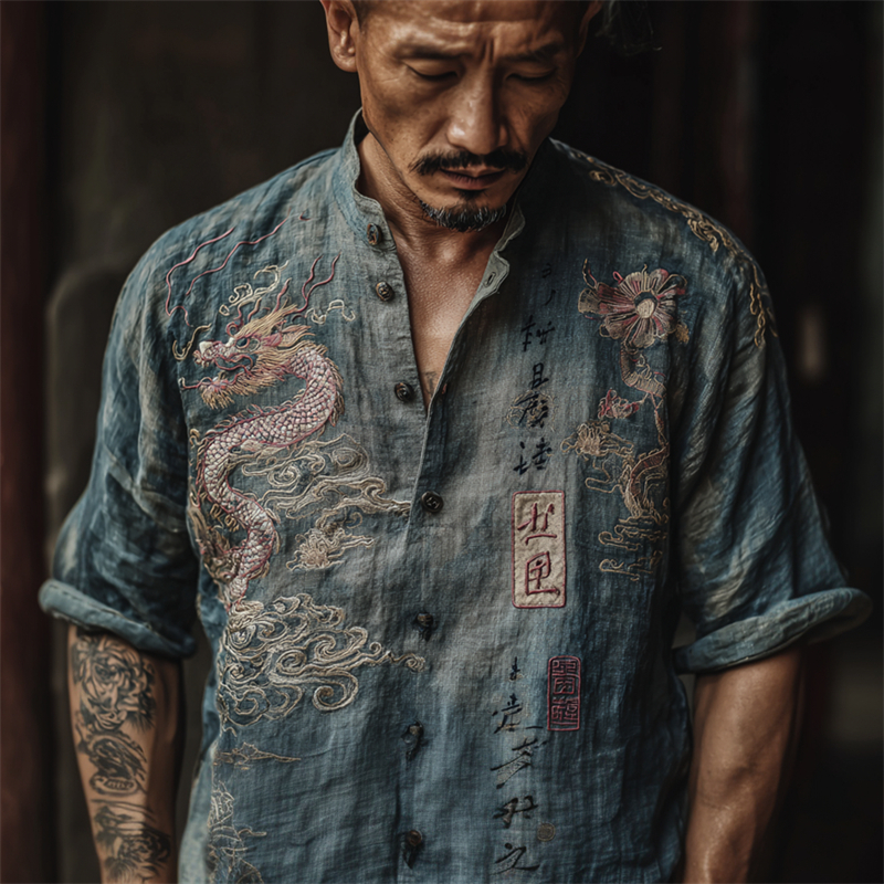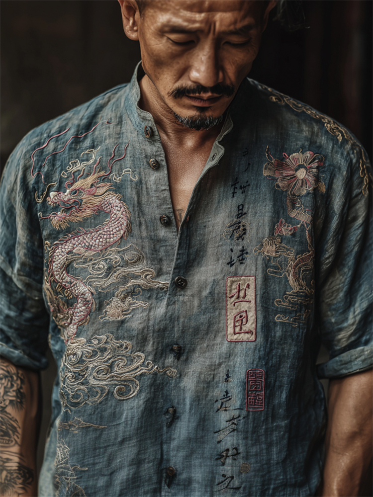 Men's Japanese Dragon Floral Calligraphy Linen Shirt