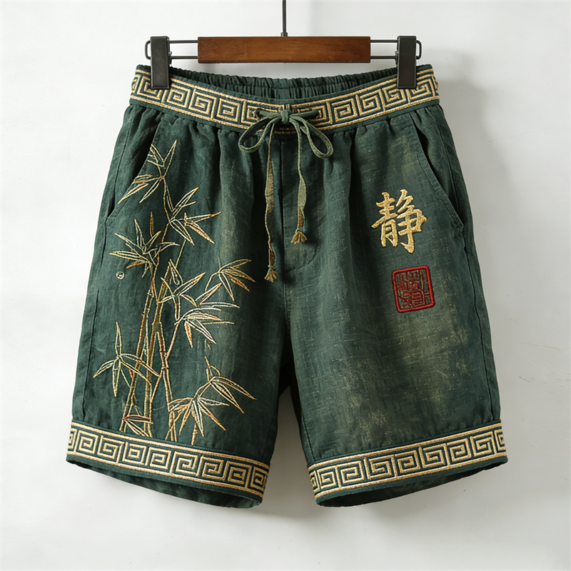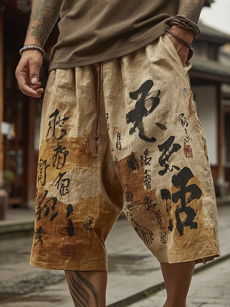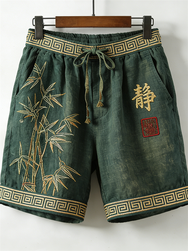 Men's Japanese Bamboo Calligraphy Art Drawstring Linen Shorts