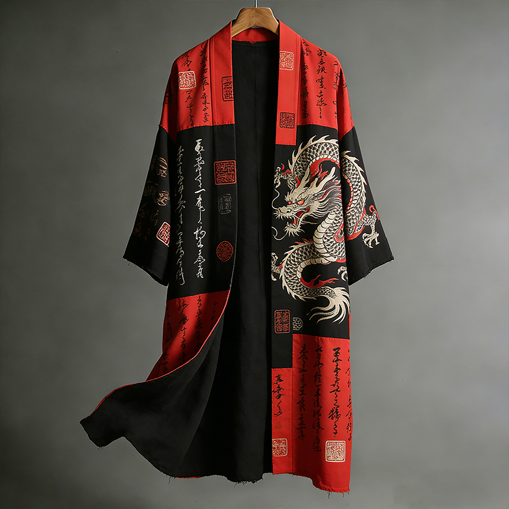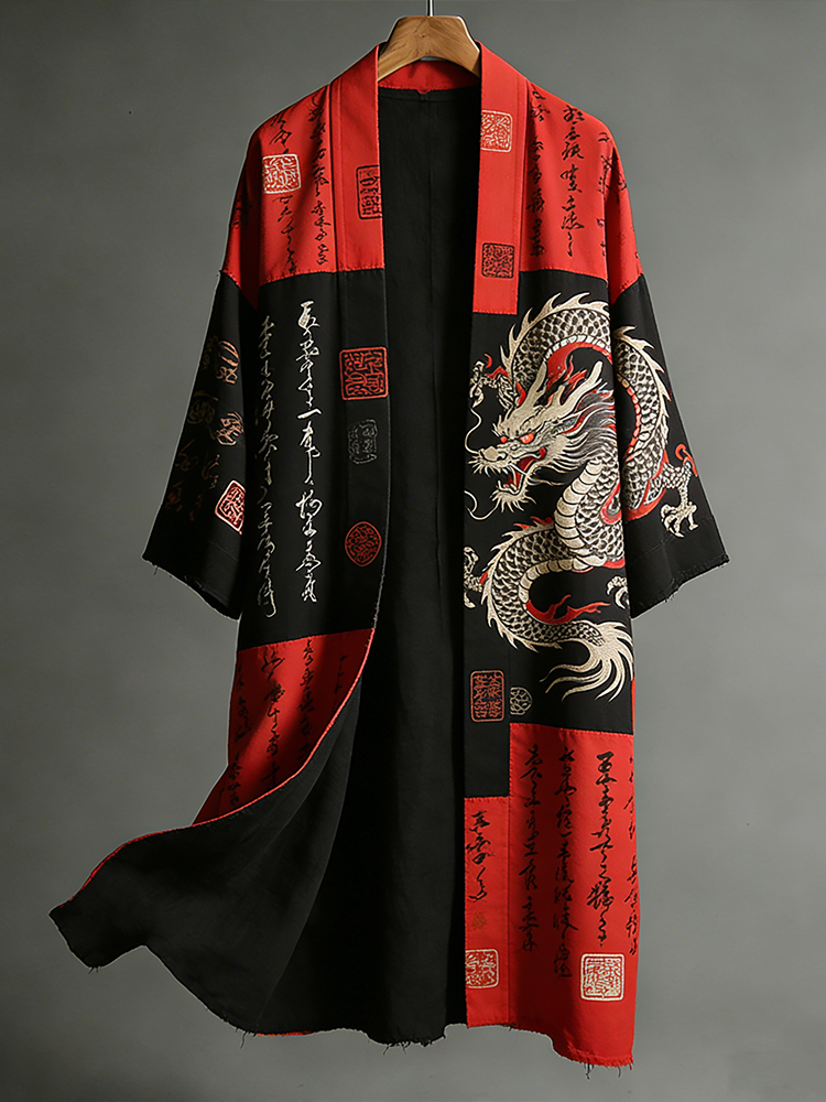 Men's Japanese Dragon Pattern Calligraphy And Painting Art Linen Long Kimono