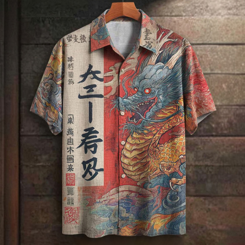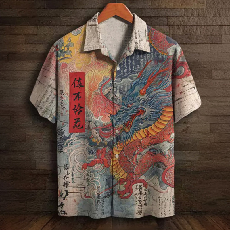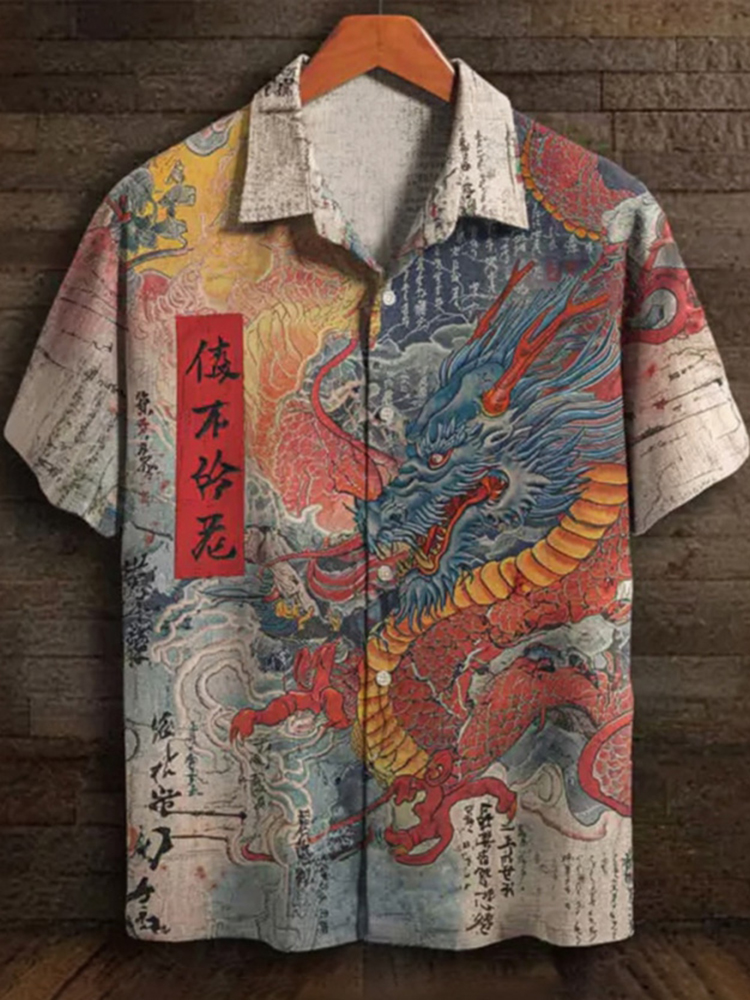 Men's Retro Japanese Dragon Print Short-sleeve Shirt