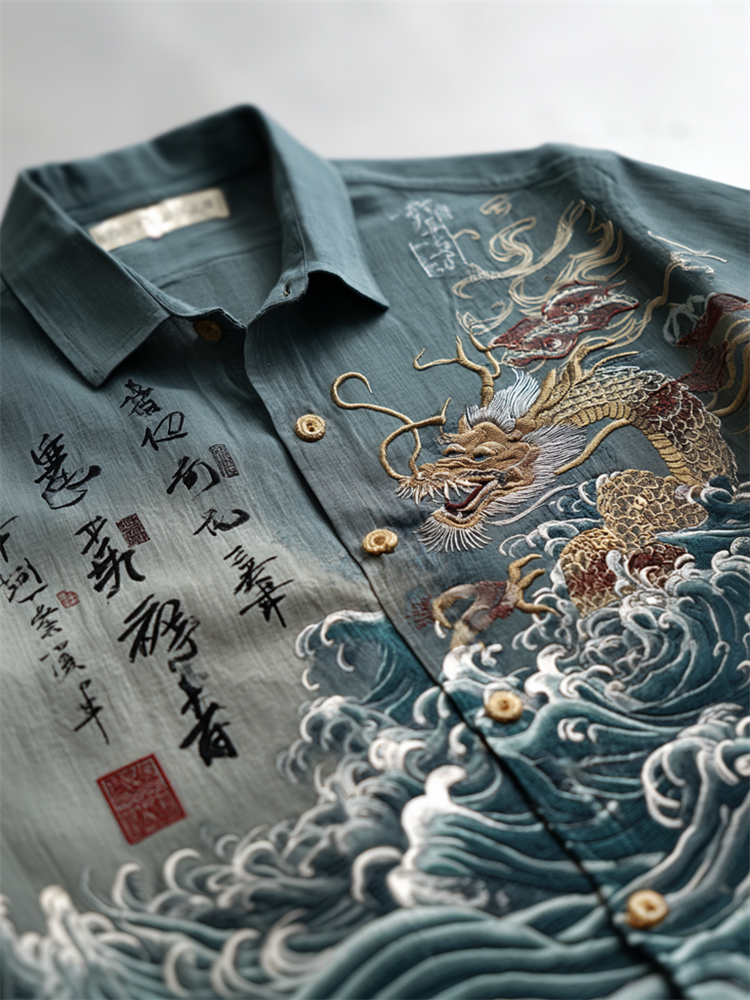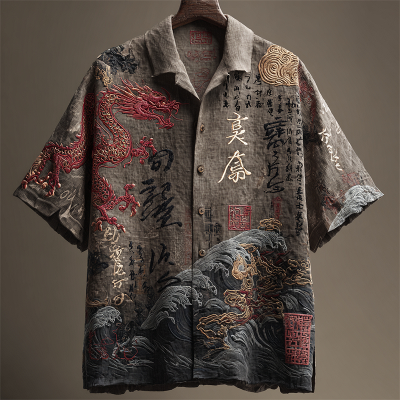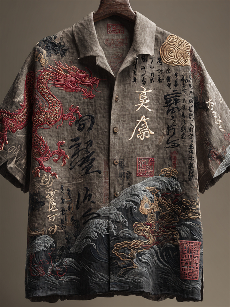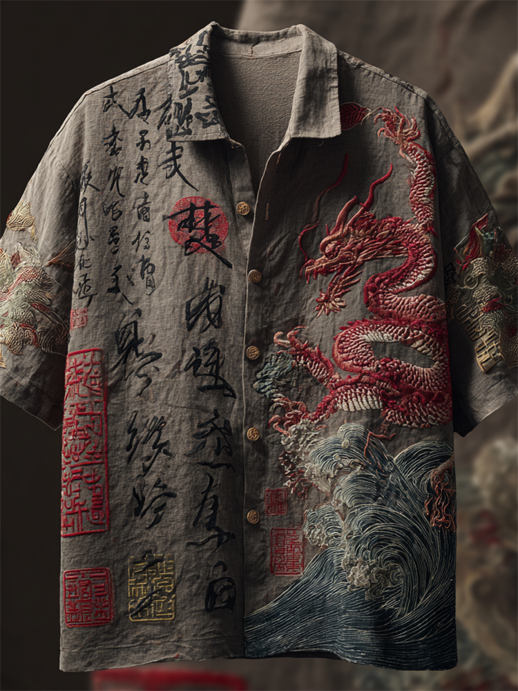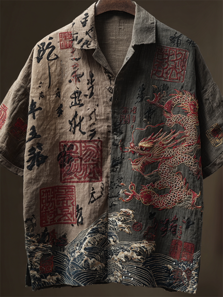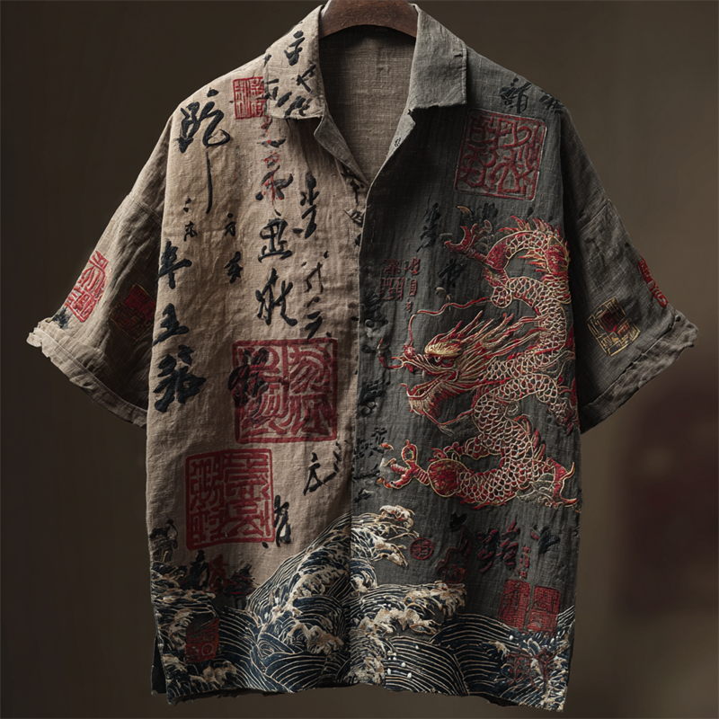 Men's Dragon Sea Waves Calligraphy Linen Shirt