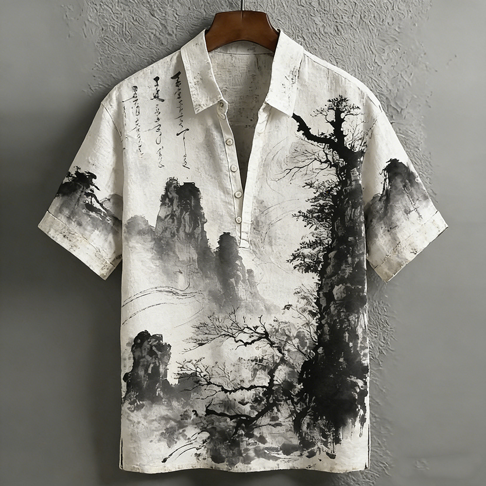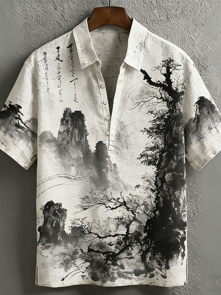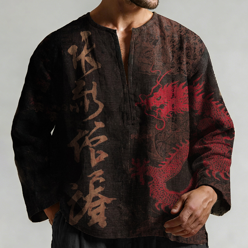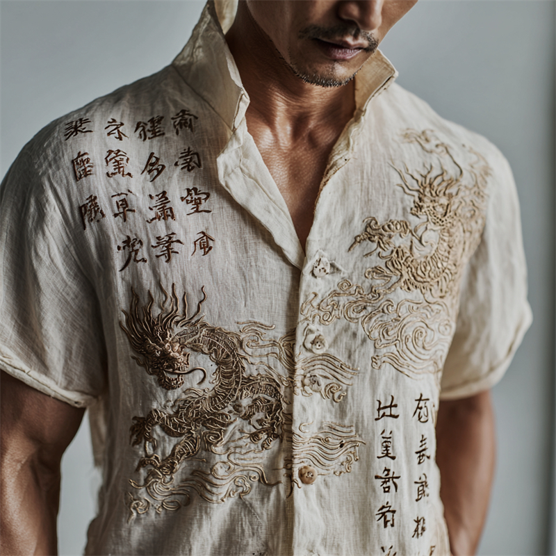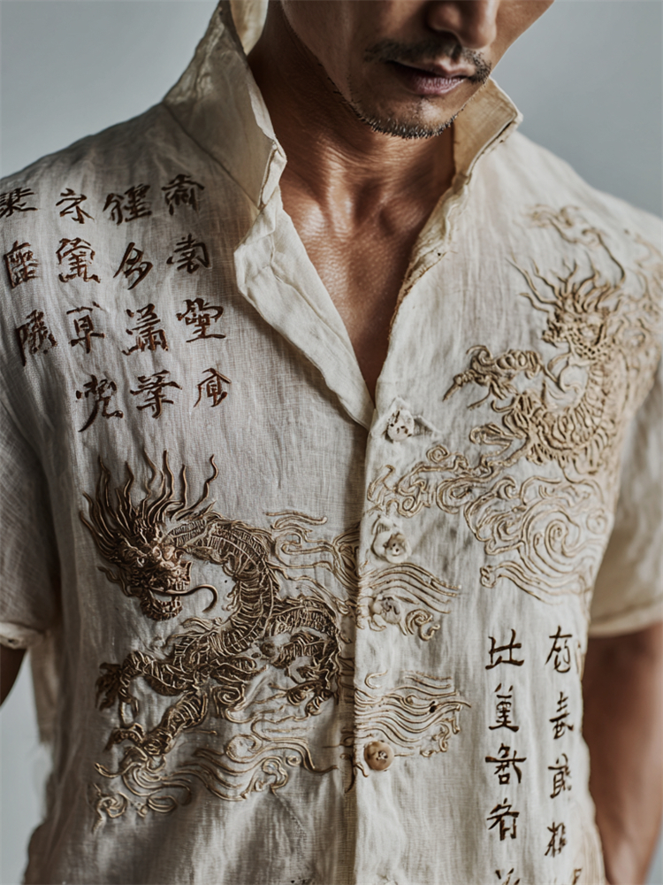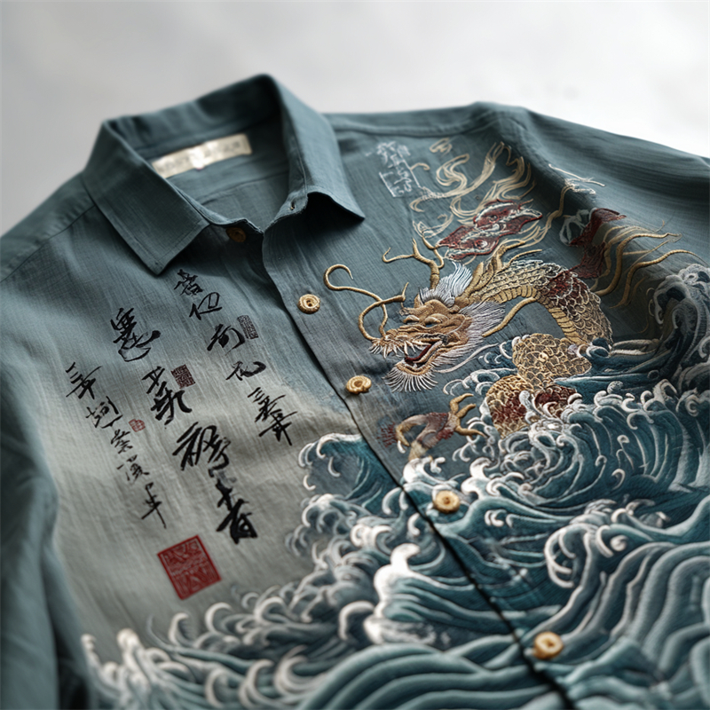 Men's Dragon Sea Waves Calligraphy Linen Shirt