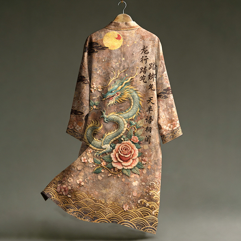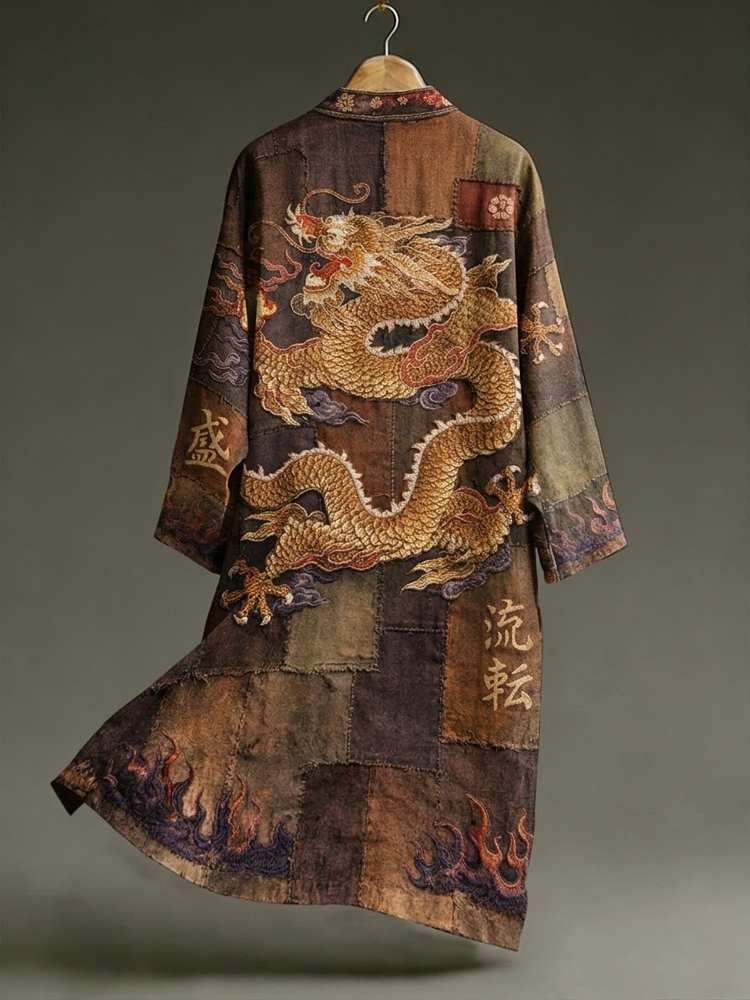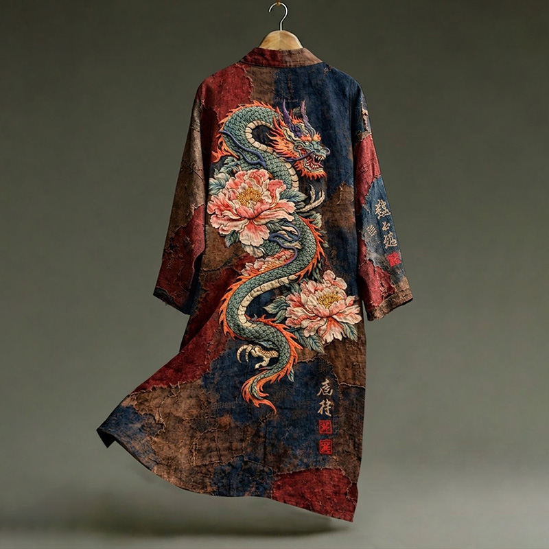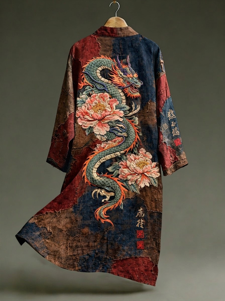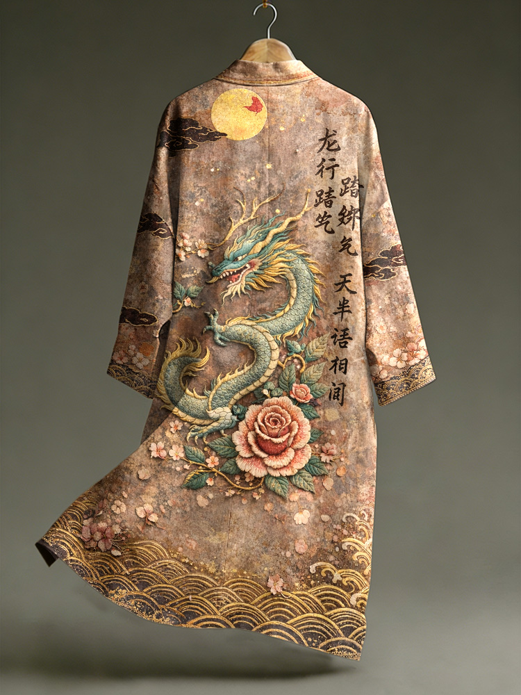Men's Vintage Japanese Dragon And Flower Art Linen Blend Long Kimono