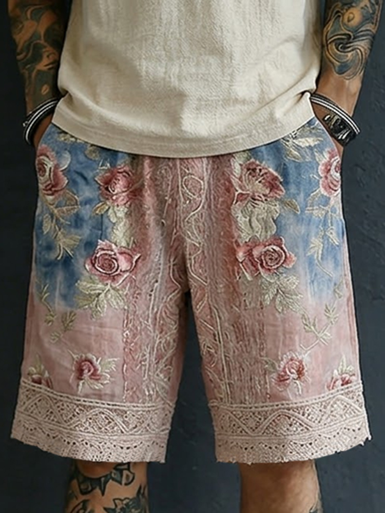 Men's Vintage Spring Floral Embroidered Art Print Flowy Linen Blend Casual Shorts