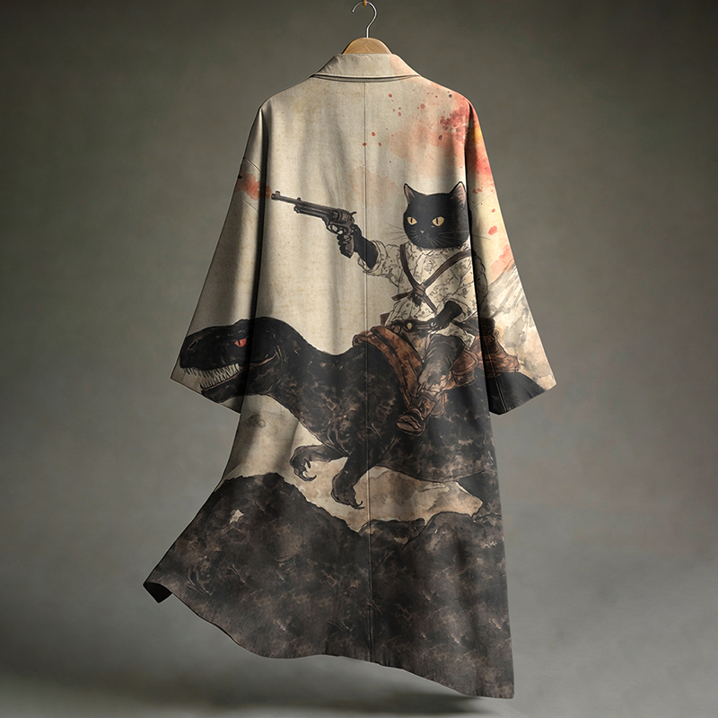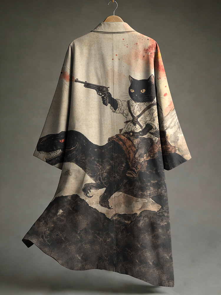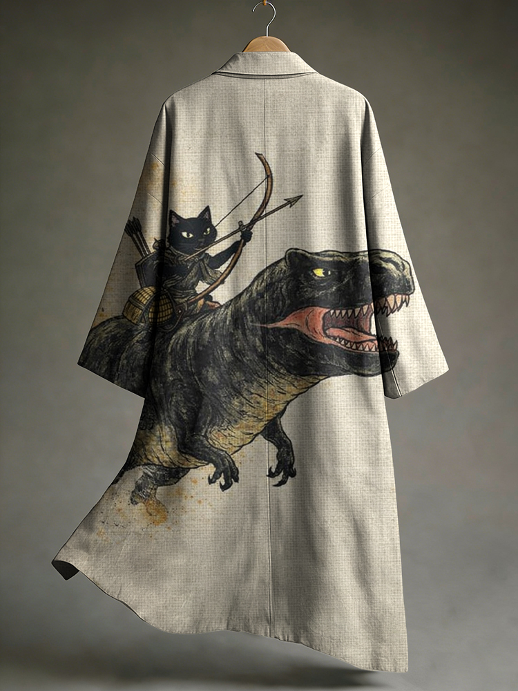 Men's Black Cat Tribal Japanese Kyudo Print Comfy Linen Long Kimono