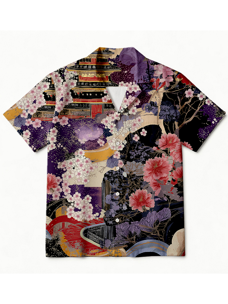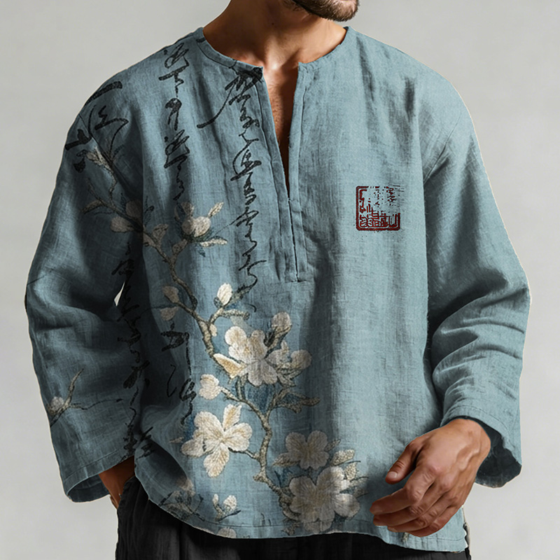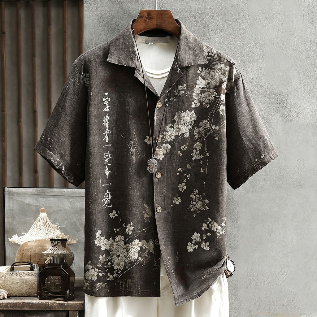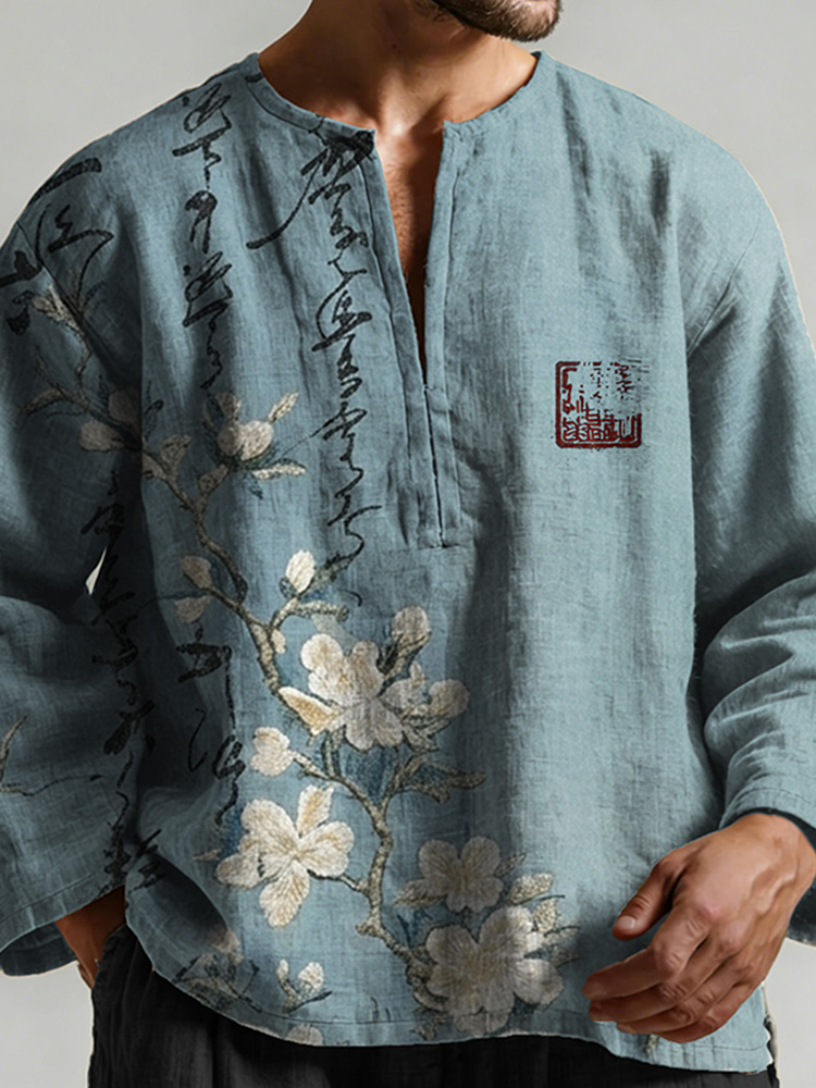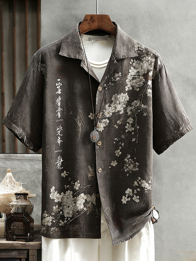 Men's Retro Japanese Cherry Blossom Calligraphy Art Pattern Casual Linen Blend Shirt