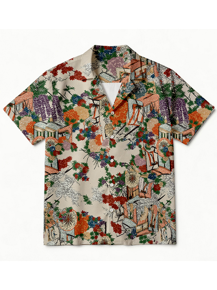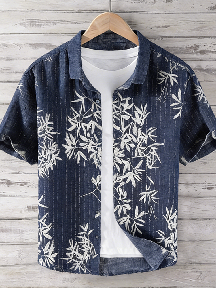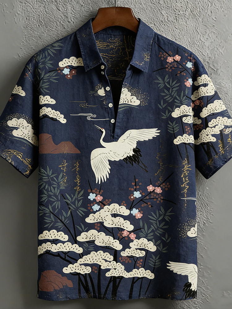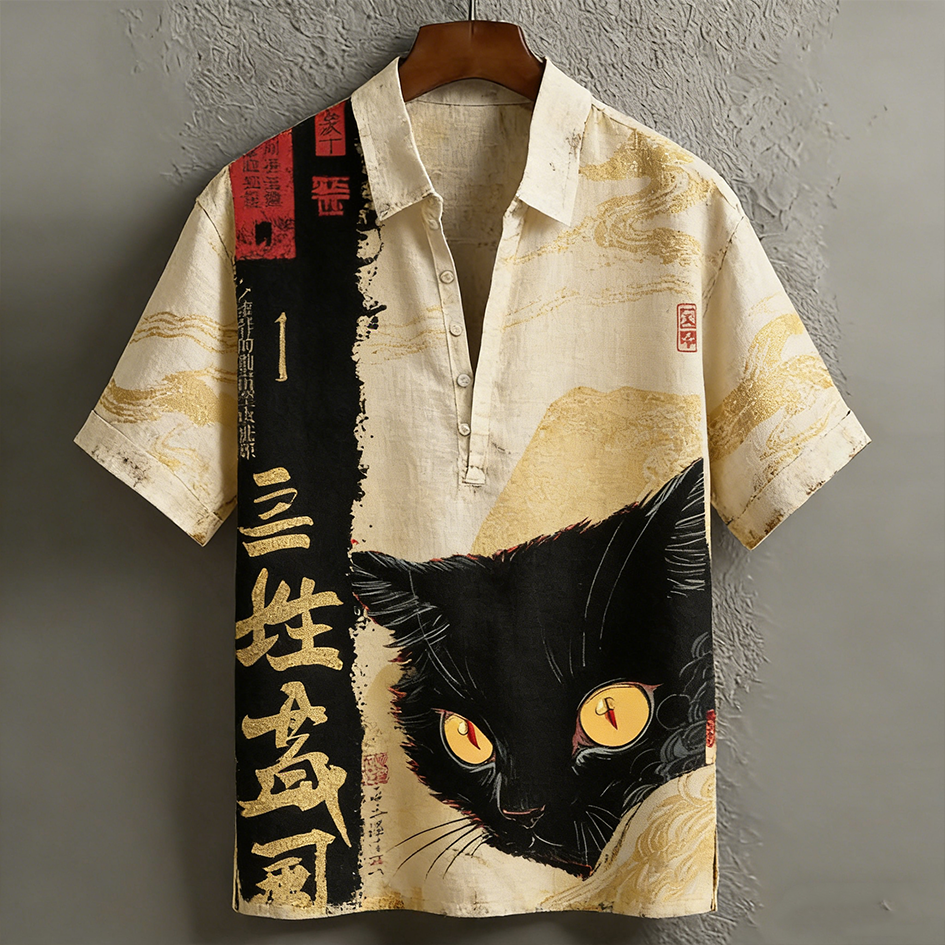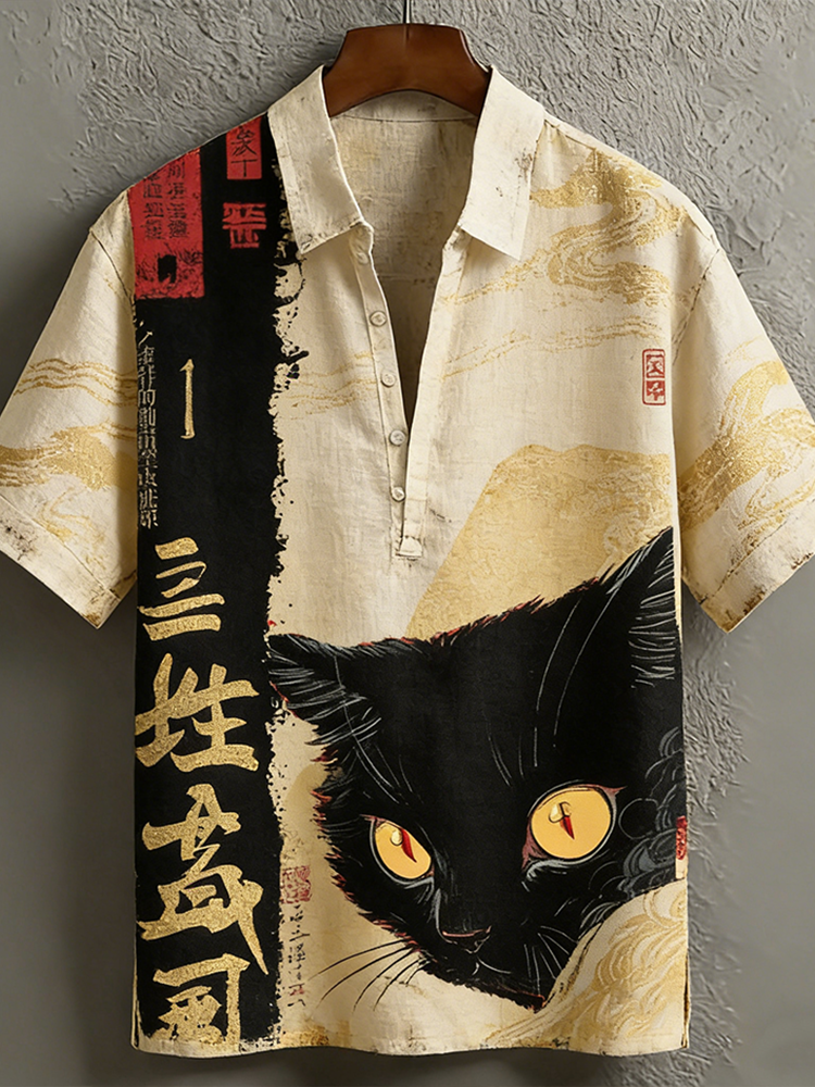 Men's Retro Japanese Cherry Blossom Calligraphy Art Pattern Casual Linen Blend Shirt