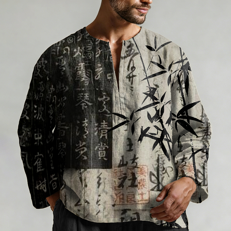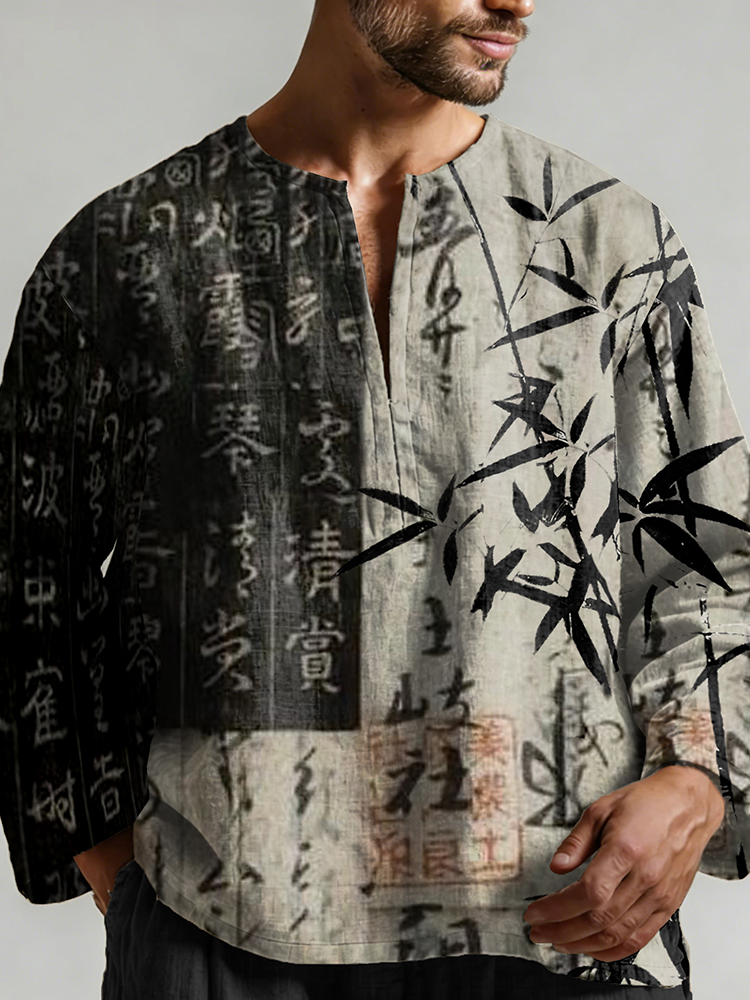 Retro Calligraphy With Bamboo Art Pattern Long Sleeve Linen Shirt