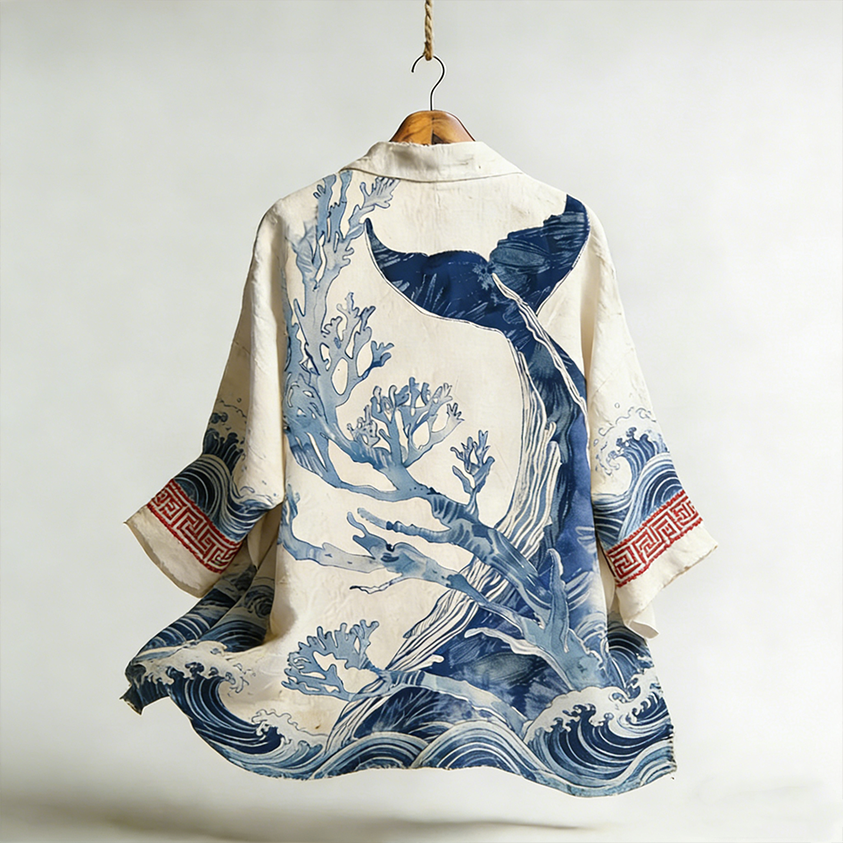 Japanese Art Retro Ocean Animal Pattern Casual Linen Cardigan