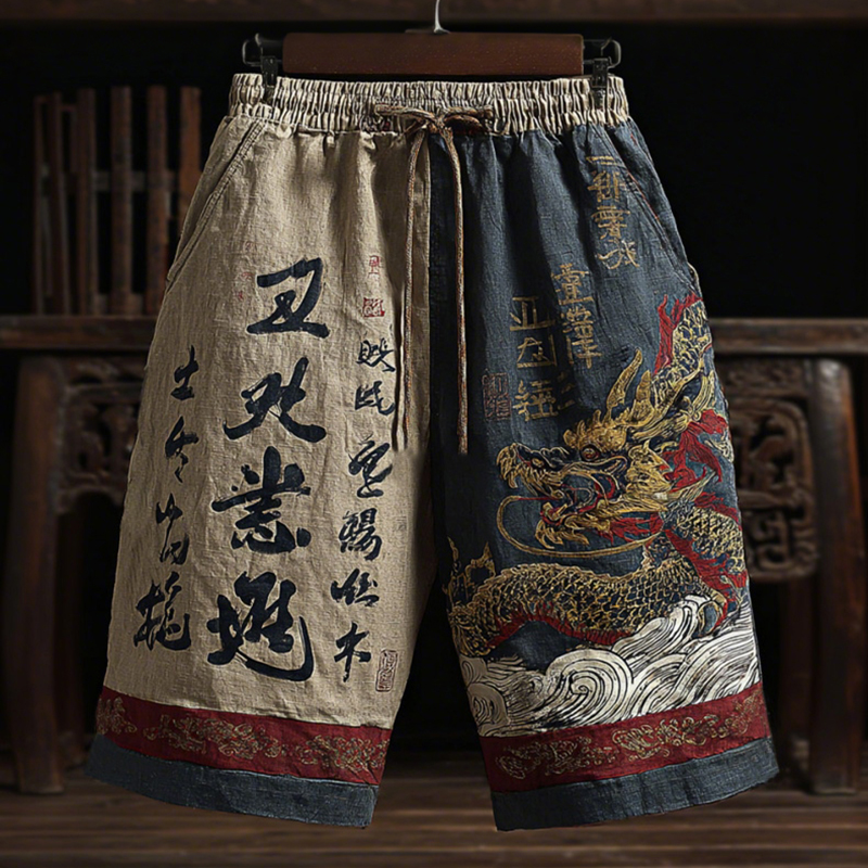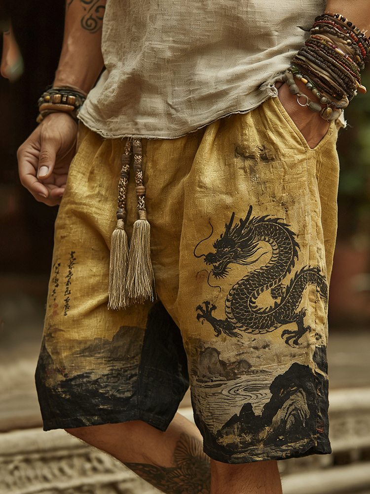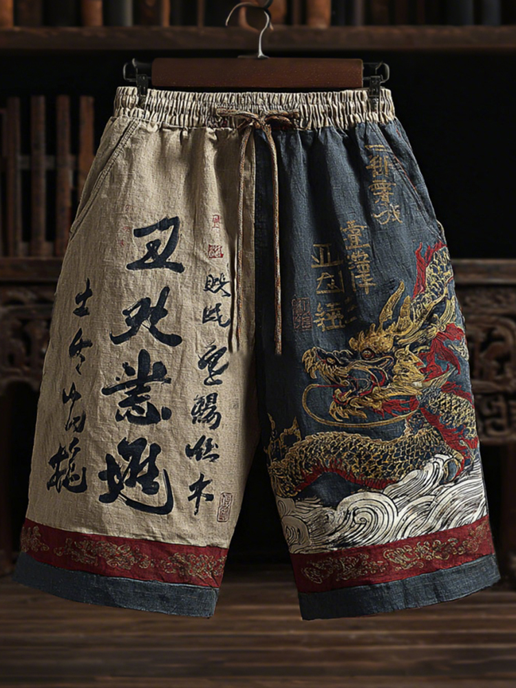 Men's Japanese-style Linen Shorts With Dragon And Calligraphy Patterns