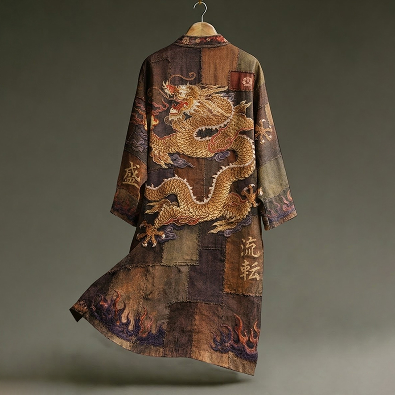 Men's Vintage Japanese Dragon Art Linen Blend Long Kimono