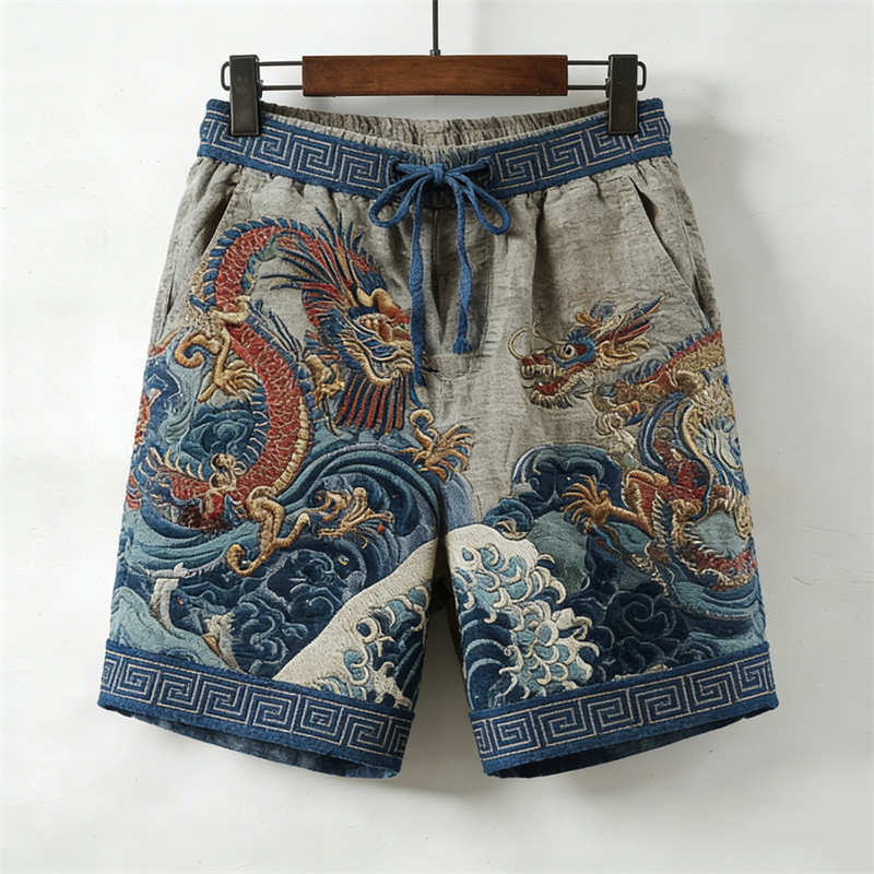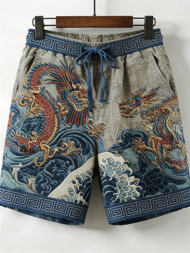 Men's Japanese Dragons & Sea Waves Drawstring Linen Shorts