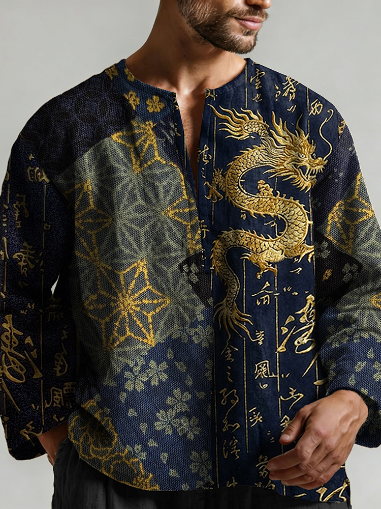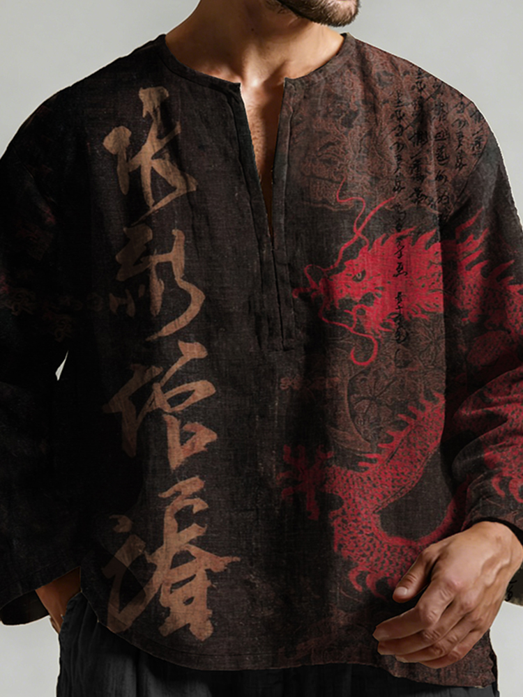 Retro Calligraphy With Dragon Art Pattern Long Sleeve Linen Shirt