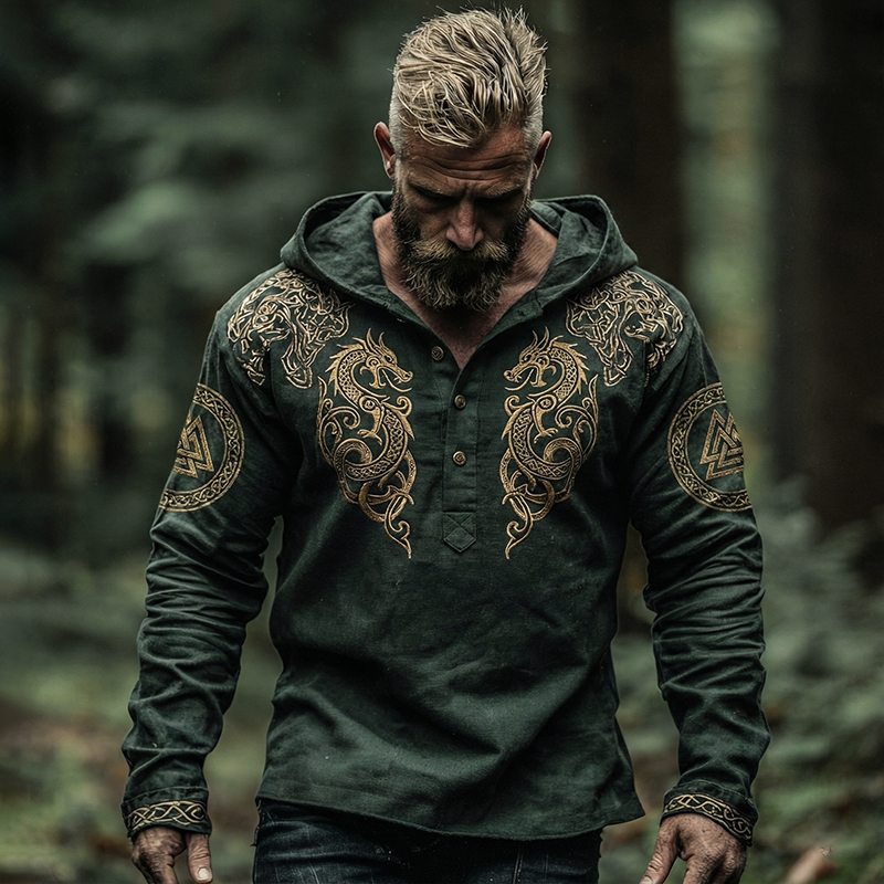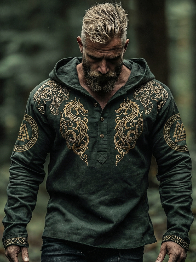 Men's Viking Dragon Celtic Art Hooded Linen Shirt