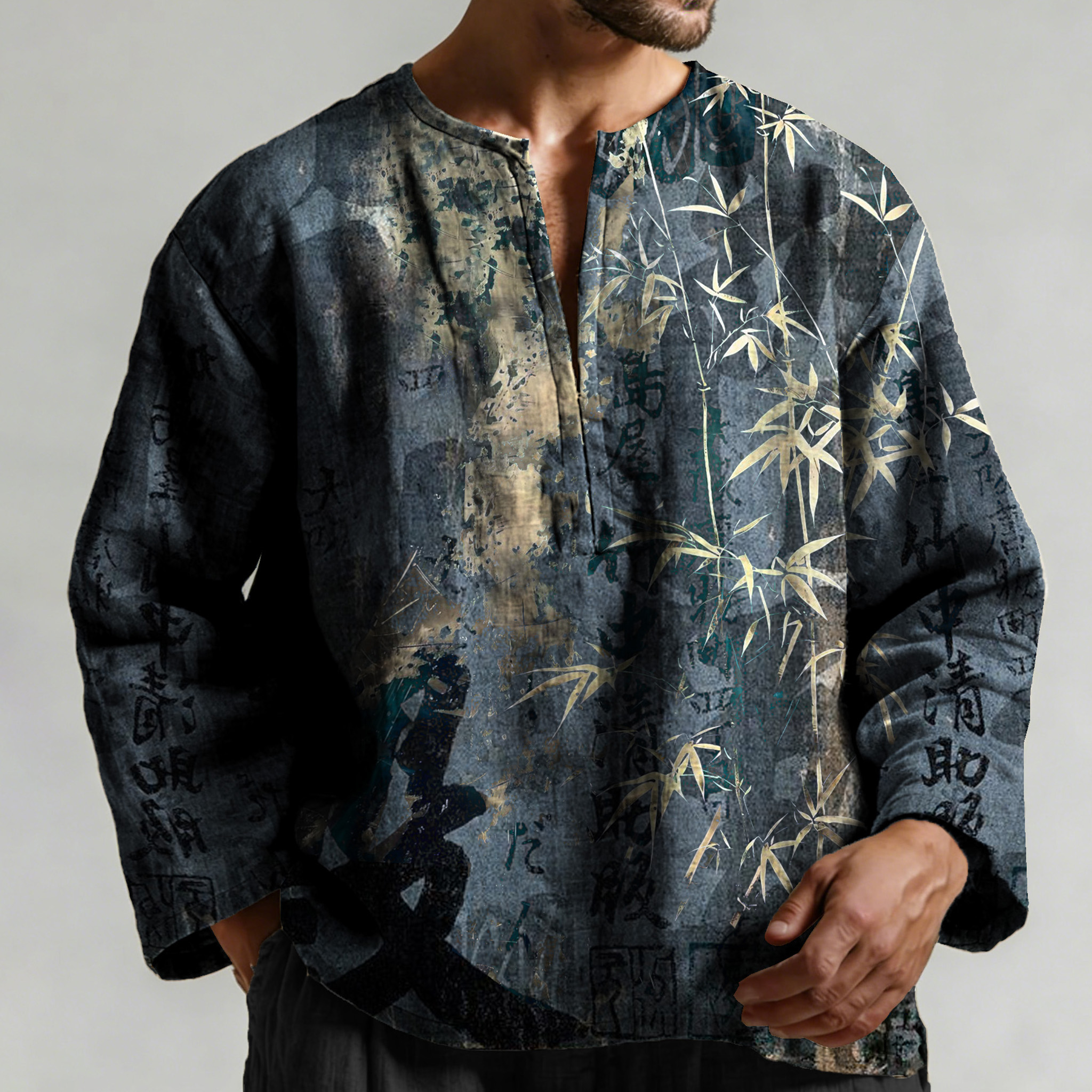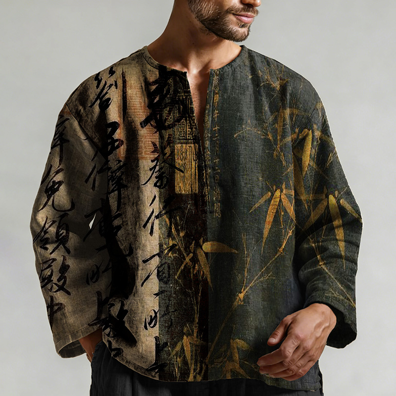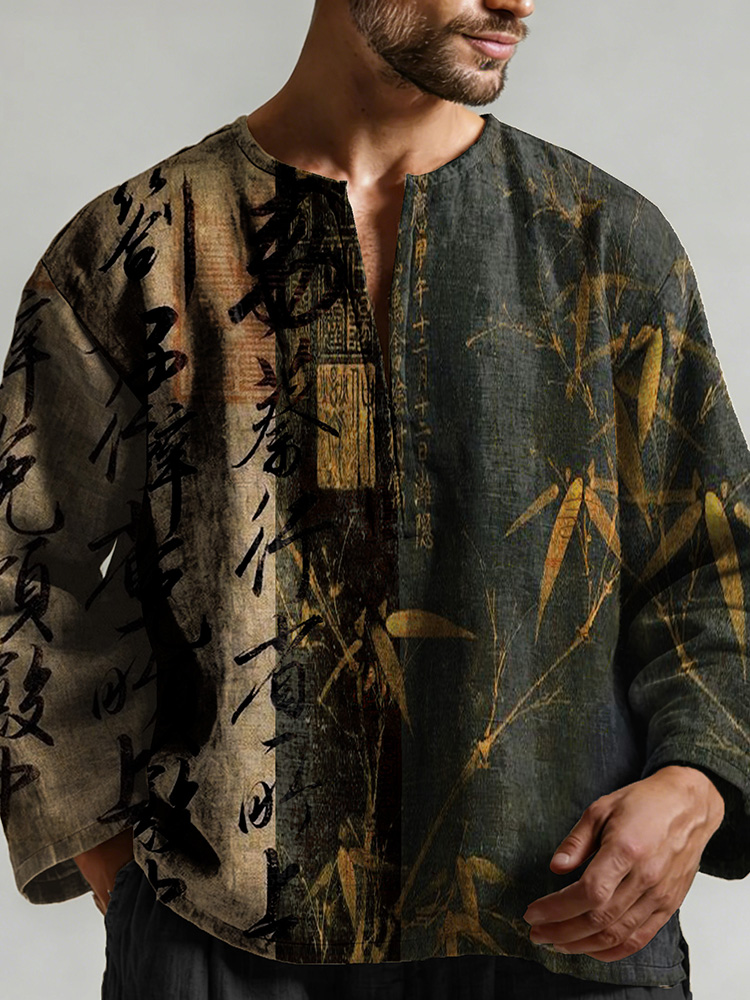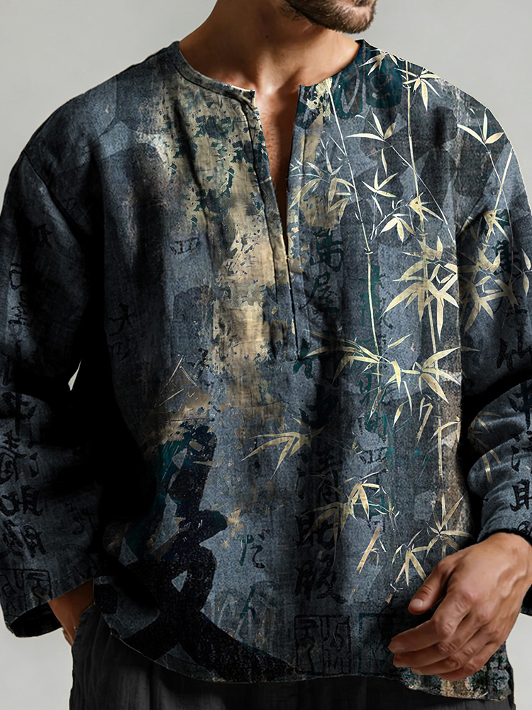 Retro Calligraphy With Bamboo Art Pattern Long Sleeve Linen Shirt