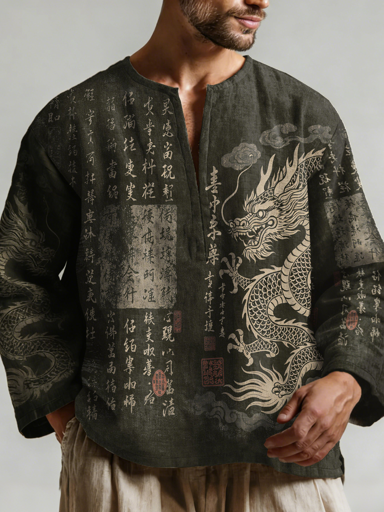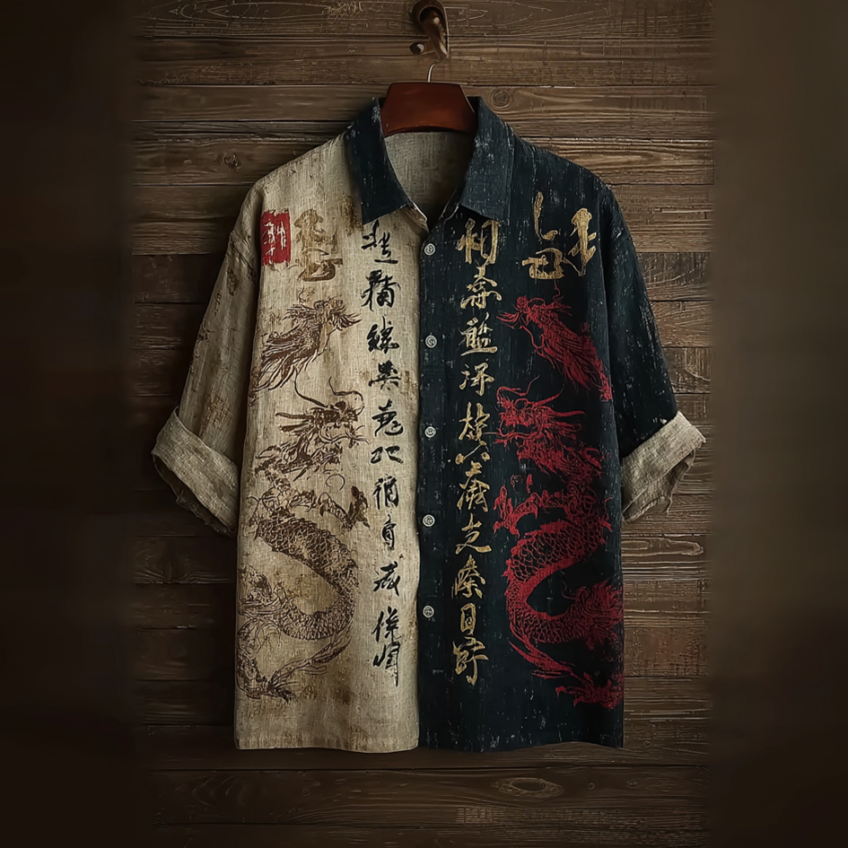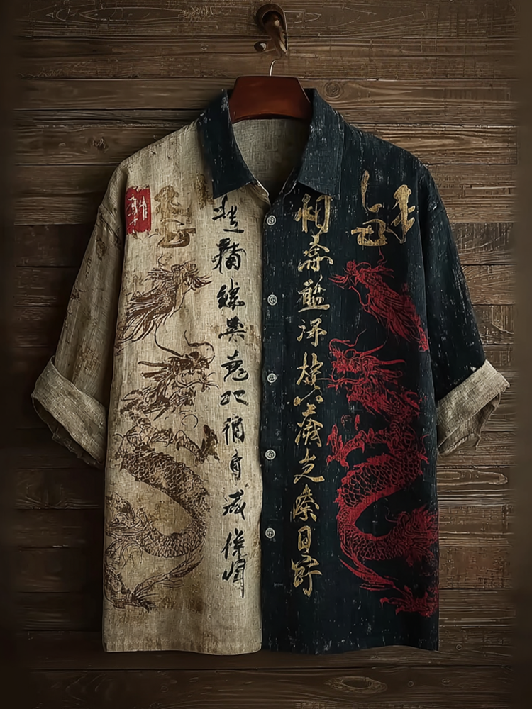 Men's Japanese Calligraphy Dragon Art Pattern Casual Linen Shirt