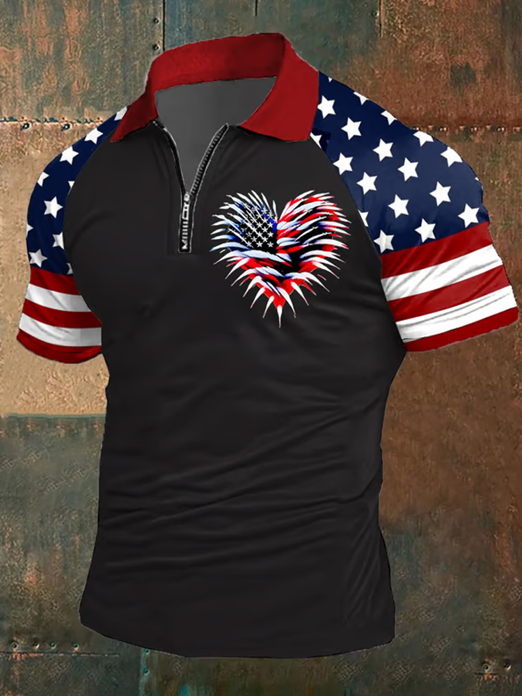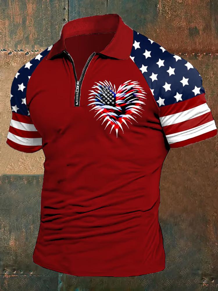 Men's Retro Independence Day Flag Heart Fireworks Print Zip-up Raglan Sleeve Polo Shirt