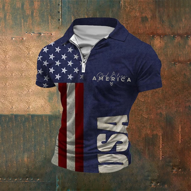 Men's Casual Independence Day Flag Print Zipper Polo Shirt