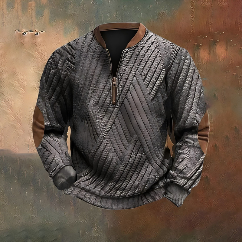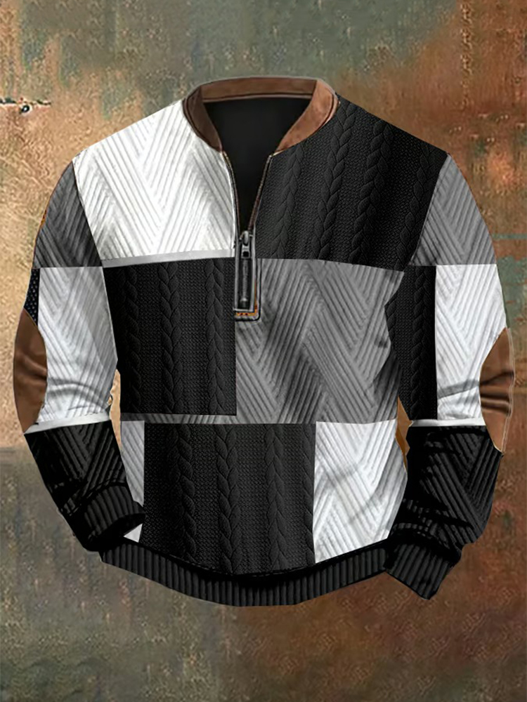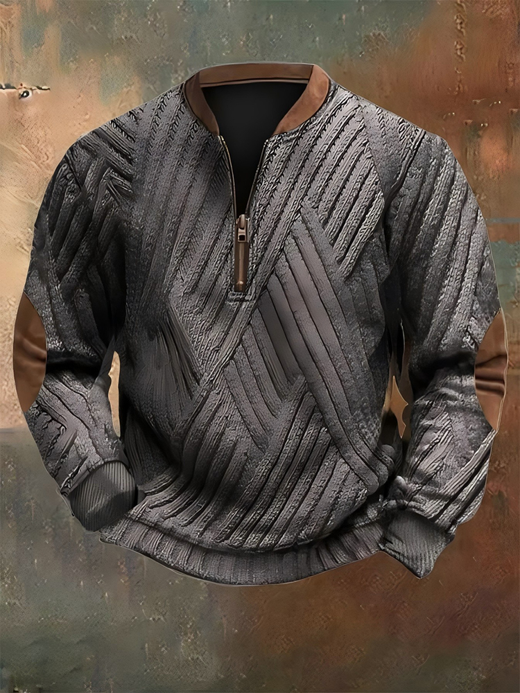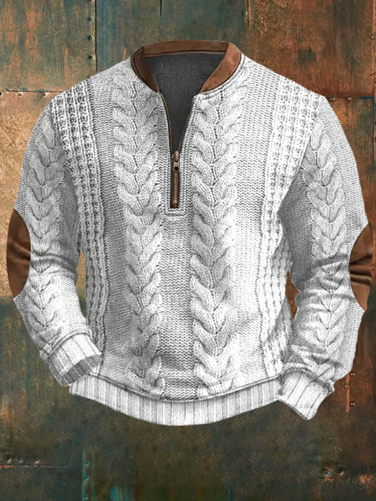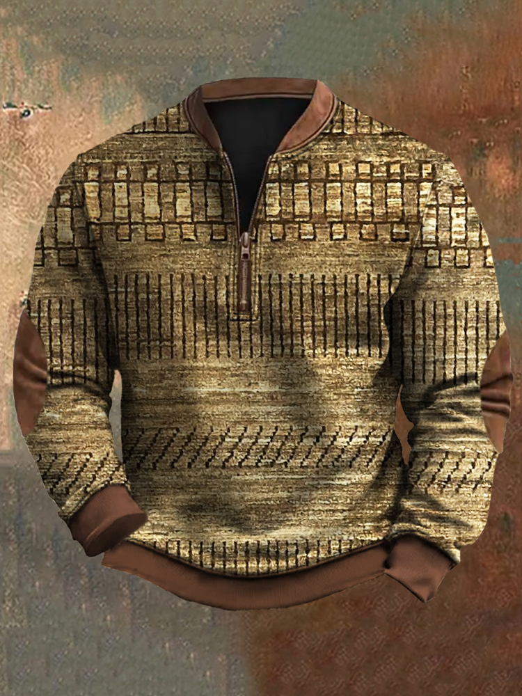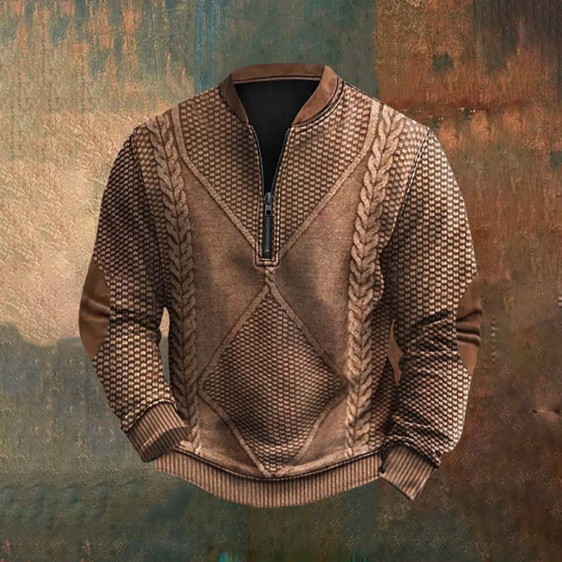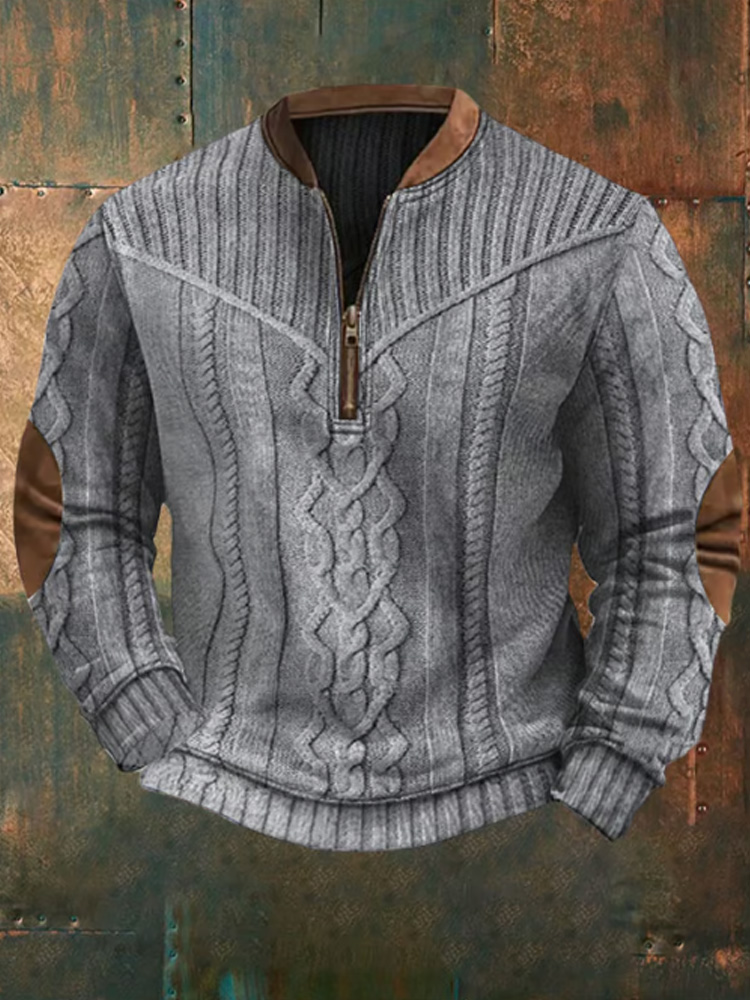 Men's Retro Western Textured Print Zipper Neck Knit Sweatshirt