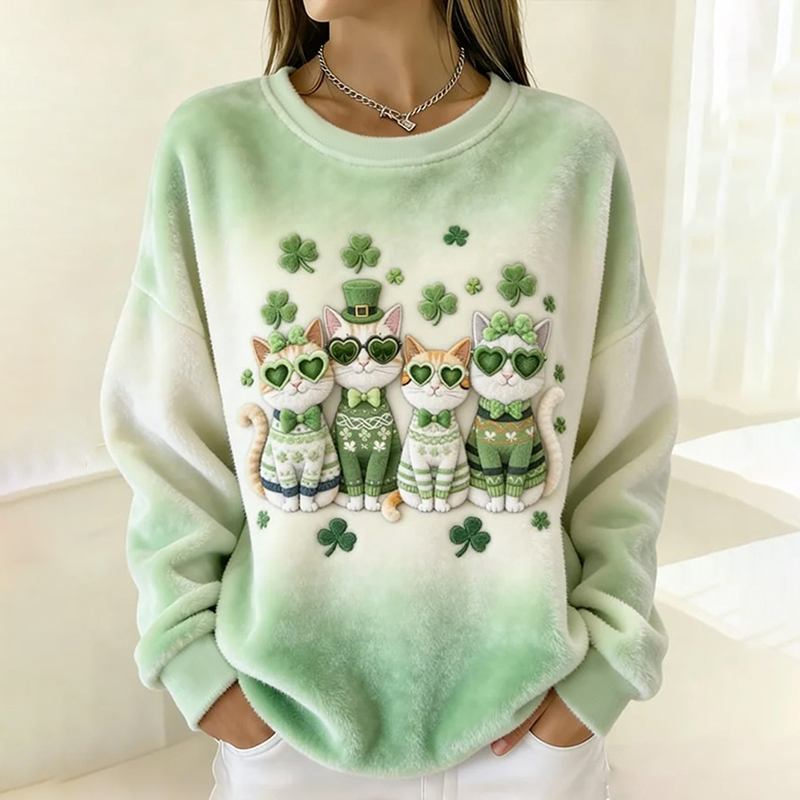 Cats Shamrocks Gradient Cozy Plush Sweatshirt