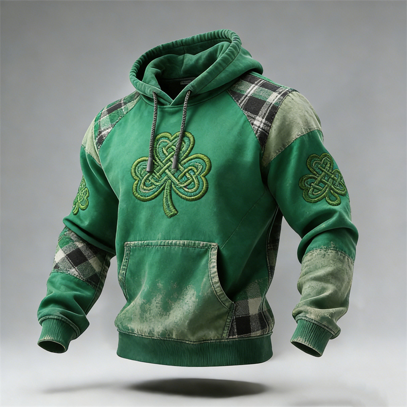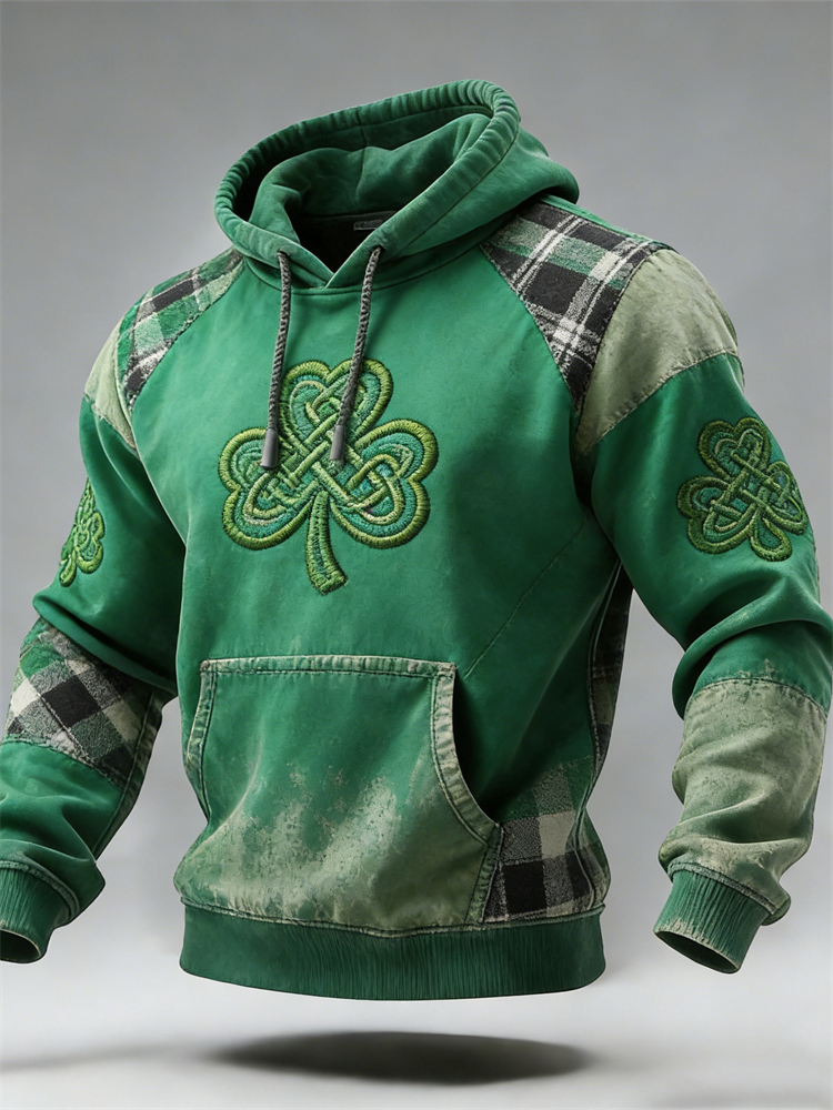 Men's St. Patrick Celtic Shamrock Plaid Colorblock Hoodie