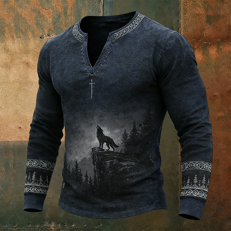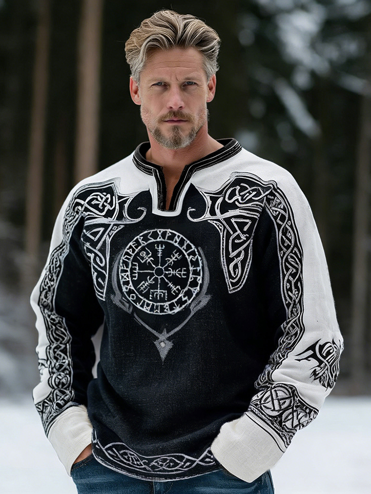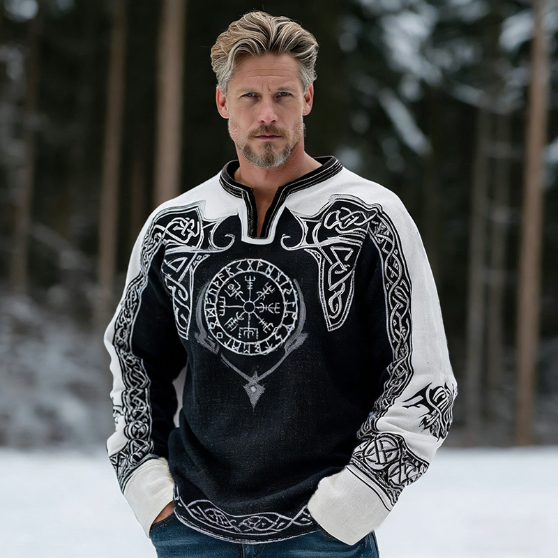 Men's Viking Tribal Jacquard Celtic Wolf Inspired Art Print Long-sleeve T-shirt