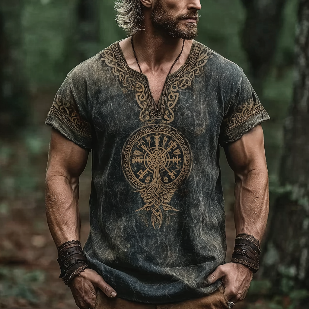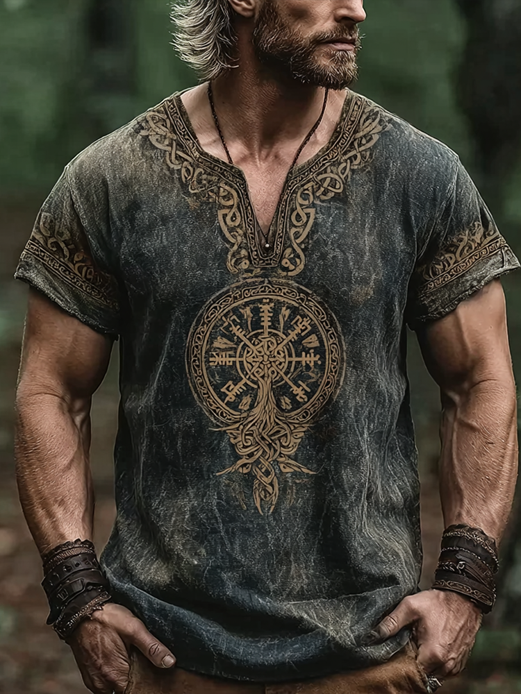 Men's Retro Viking Vegvisir Print Crew Neck T-shirt