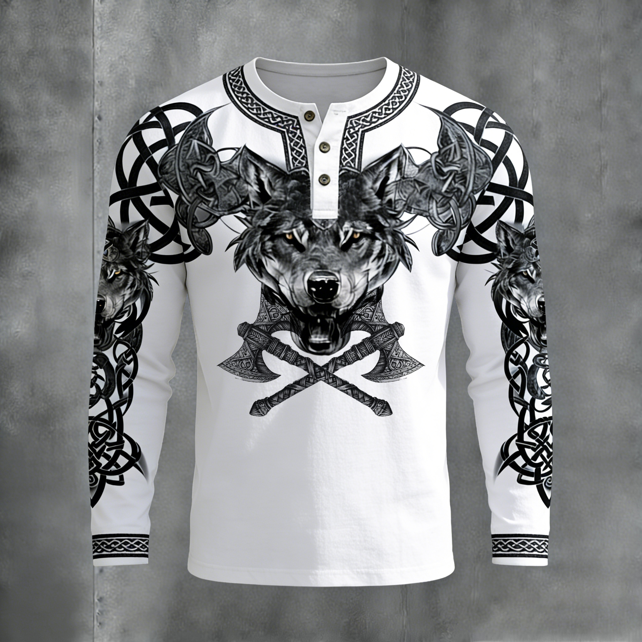 Men's Retro Viking Celtic Wolf With Axe Print Graphic Henley Collar T-shirt