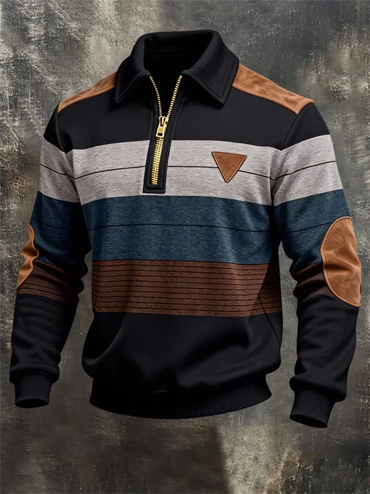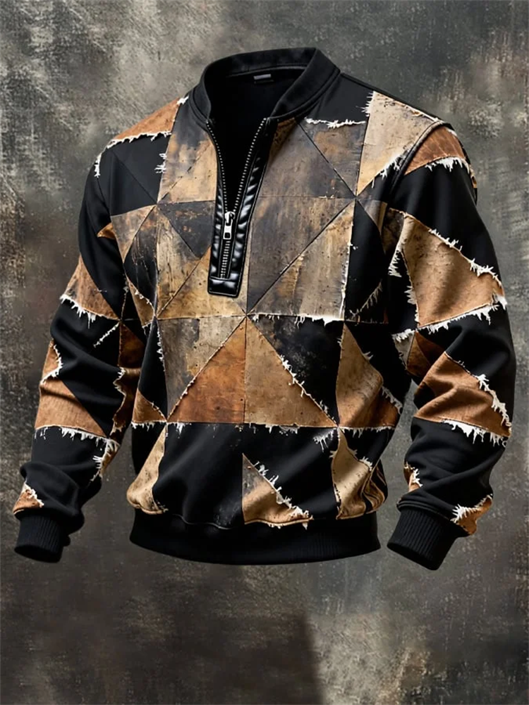 Men's Retro Color Block Print Color-blocked Zip-up Sweatshirt