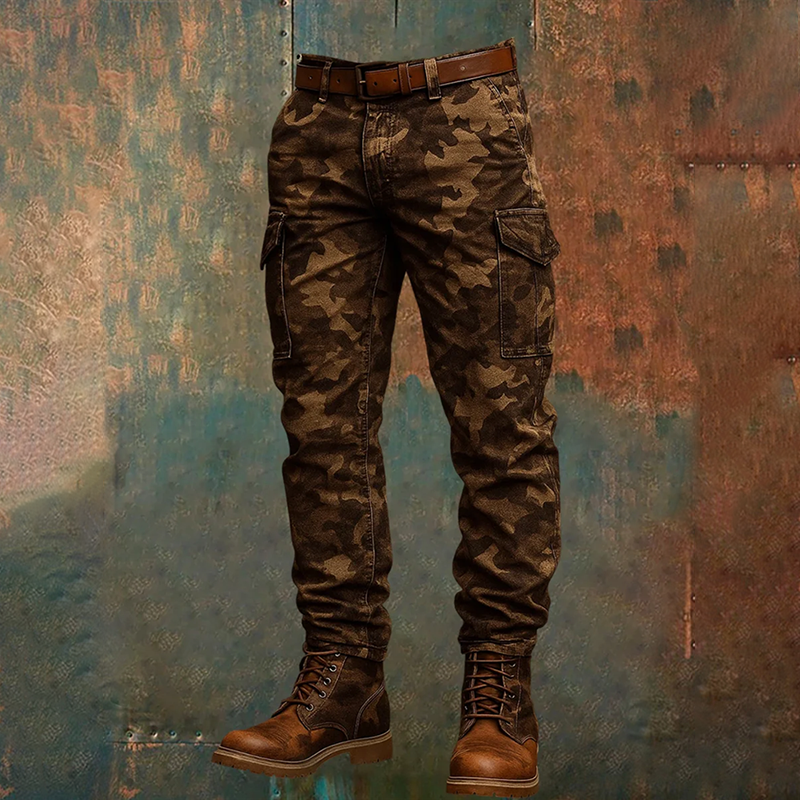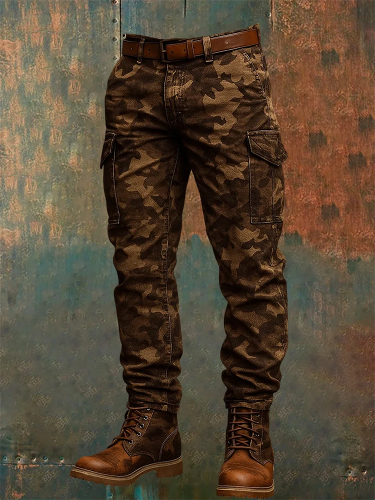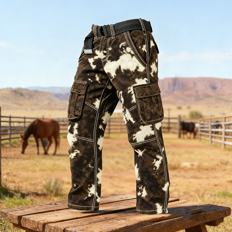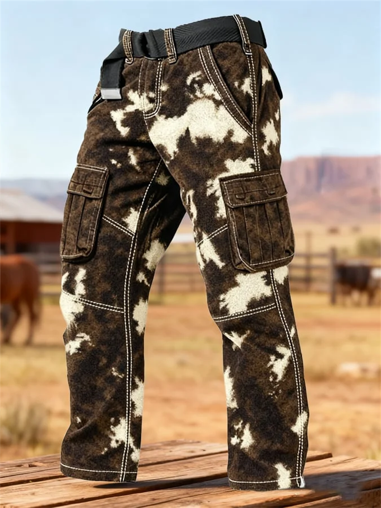 Men's Retro Cow Spot Multi-pocket Casual Work Trousers1