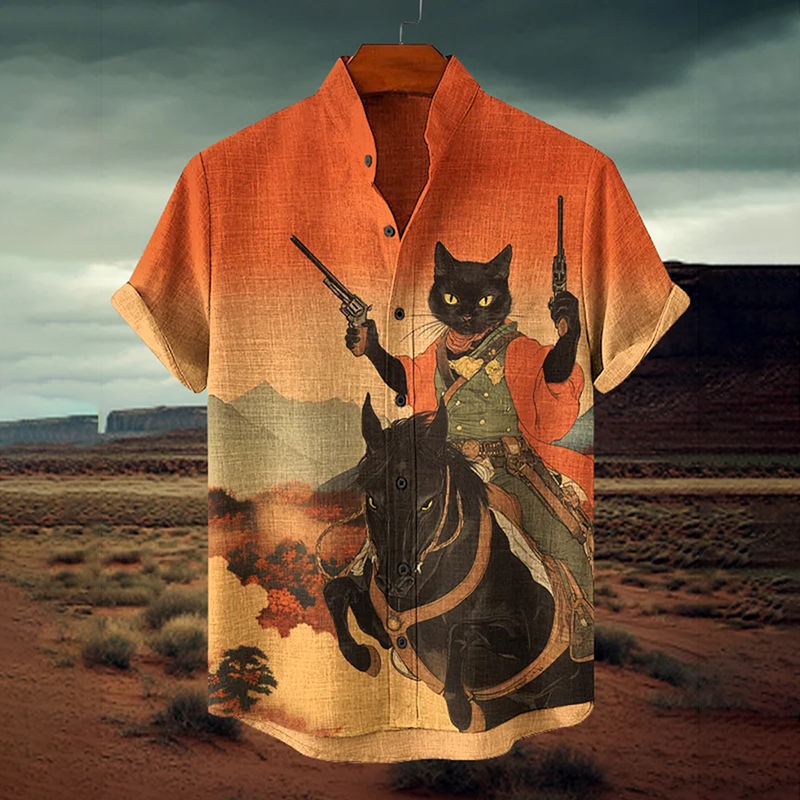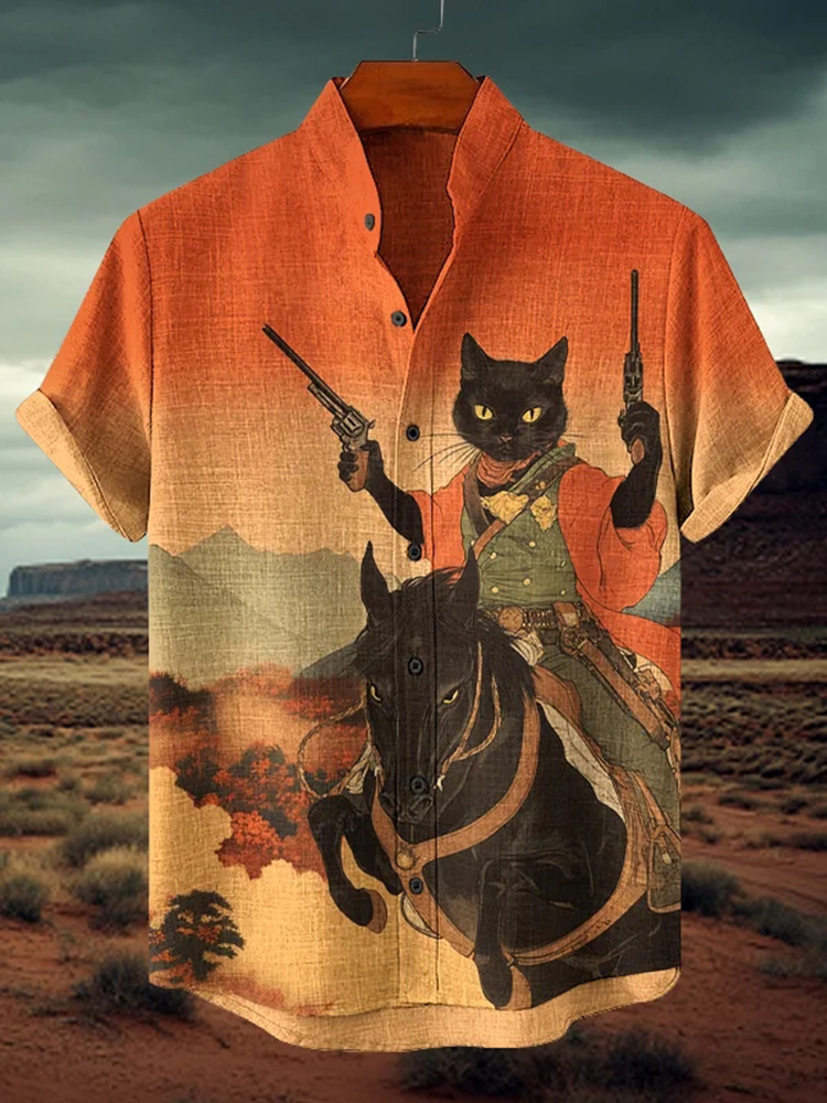 Men's Western Style Horse Black Cat Warrior Print Short Sleeve Shirt