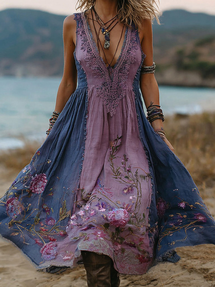 Women's Vintage Floral Embroidery Gradient Art Linen Mini Dress
